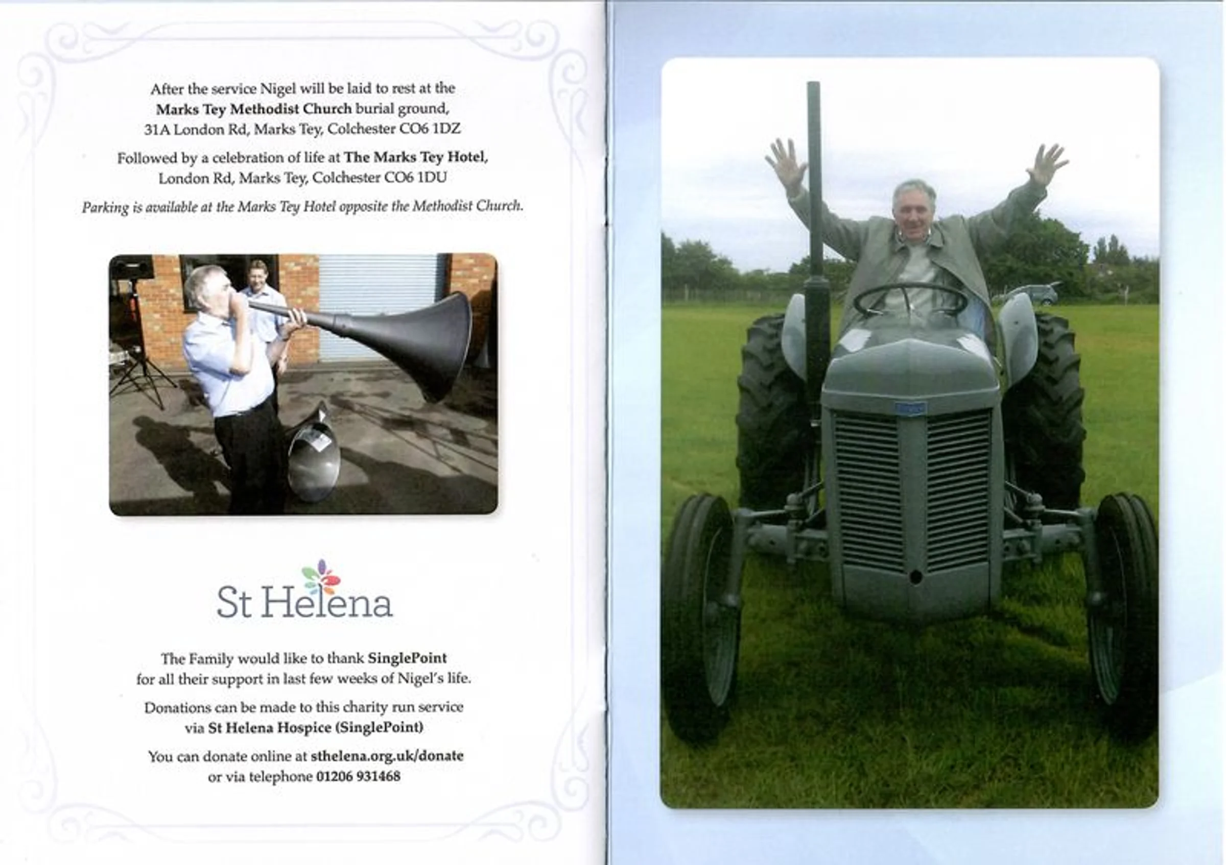 The Funeral Service sheet for Nigel Fitch, 'Mr Marks Tey'. The funeral took place at St Andrew's church, Marks Tey on 11 November 2019. (These are the two pages which were omitted from the pdf booklet and uploaded separately.)