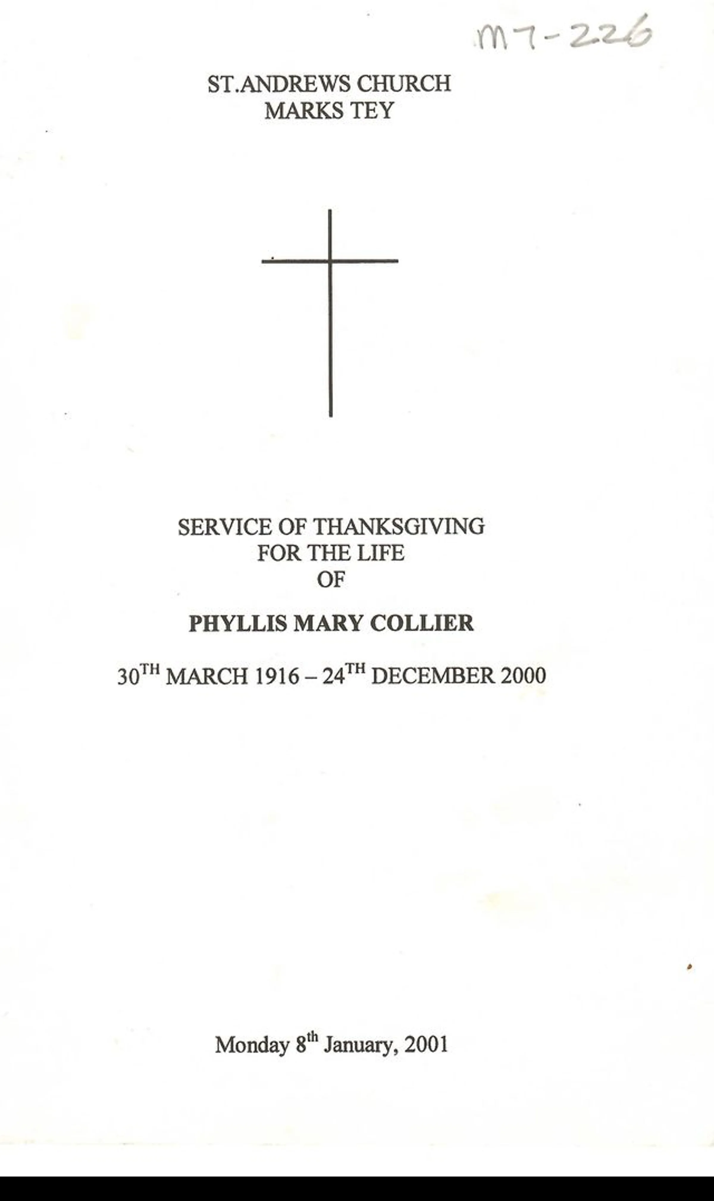 Service of Thanksgiving for the life of Phyllis Mary Collier, 30 Mar 1916 - 24 Dec 2000. Service held on Monday, 8 January 2001.