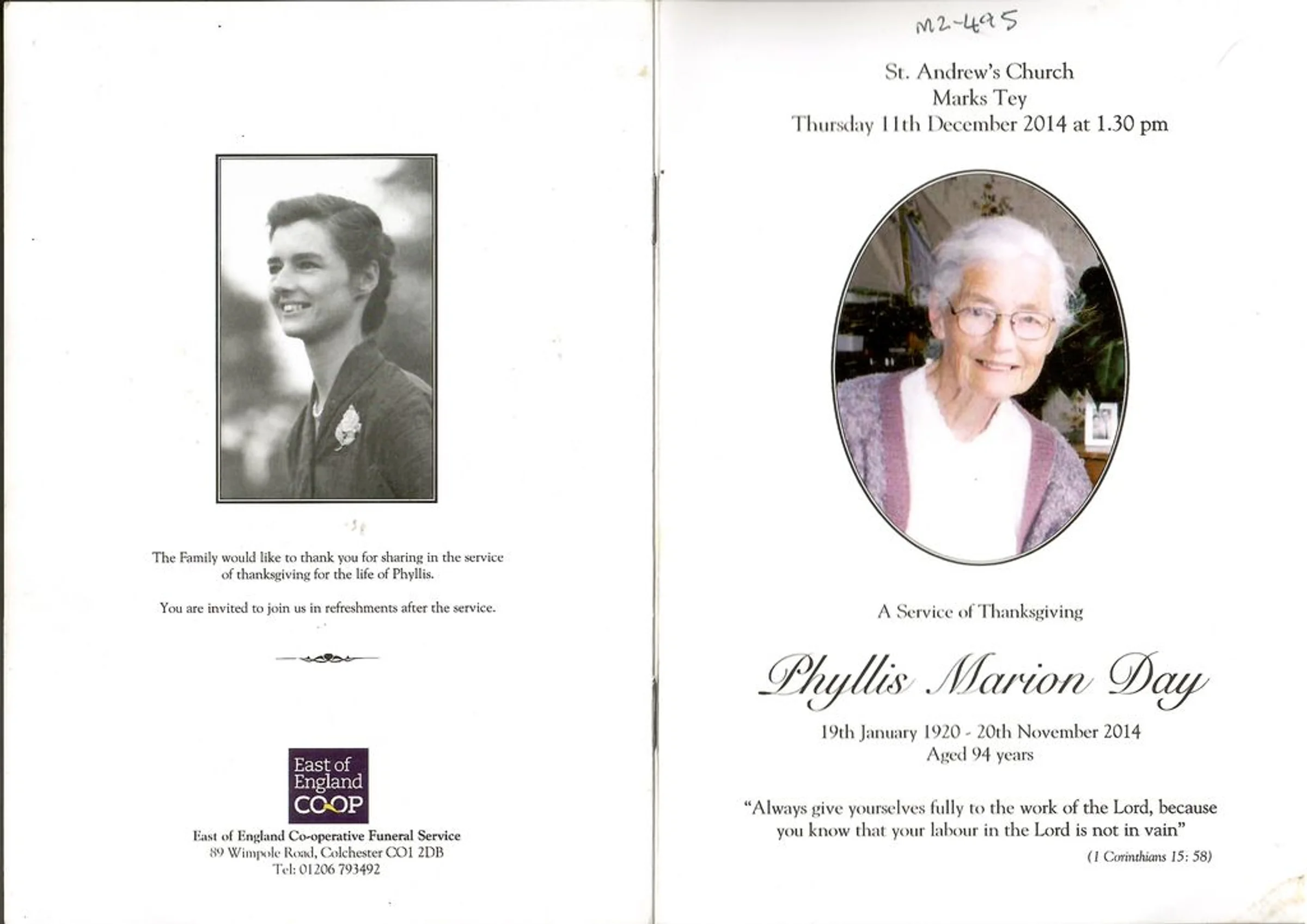 Service sheet cover from the funeral of Phyllis Marion Day in St Andrew's Church, 19th January 2014.