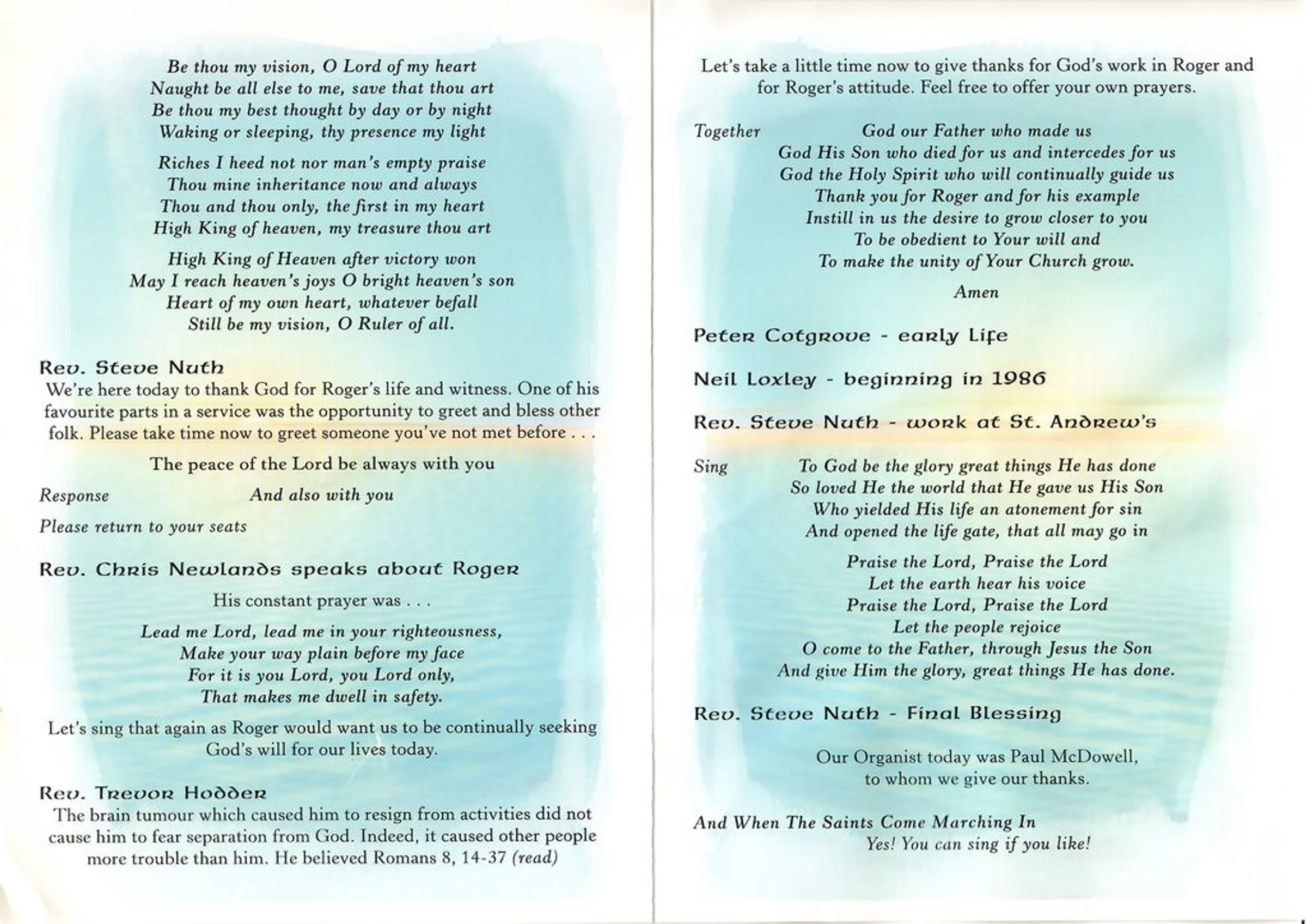 Service sheet from the funeral of Roger Rarrinder in St Andrew's Church. Page 2 of 2.