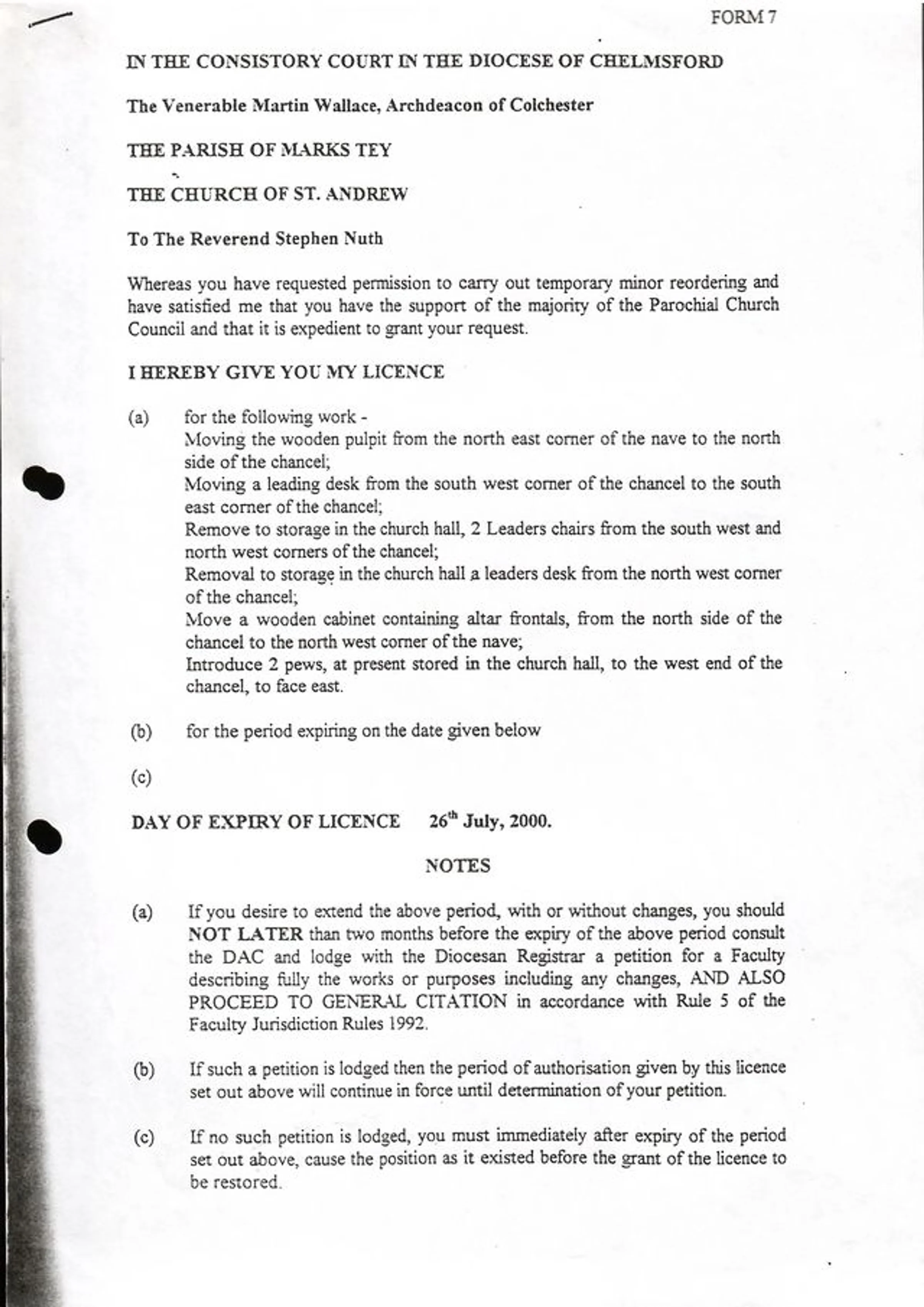 Temporary licence for the moving of furniture including the pulpit, leading desk and cabinet, licence expiring on 26th July 2000.