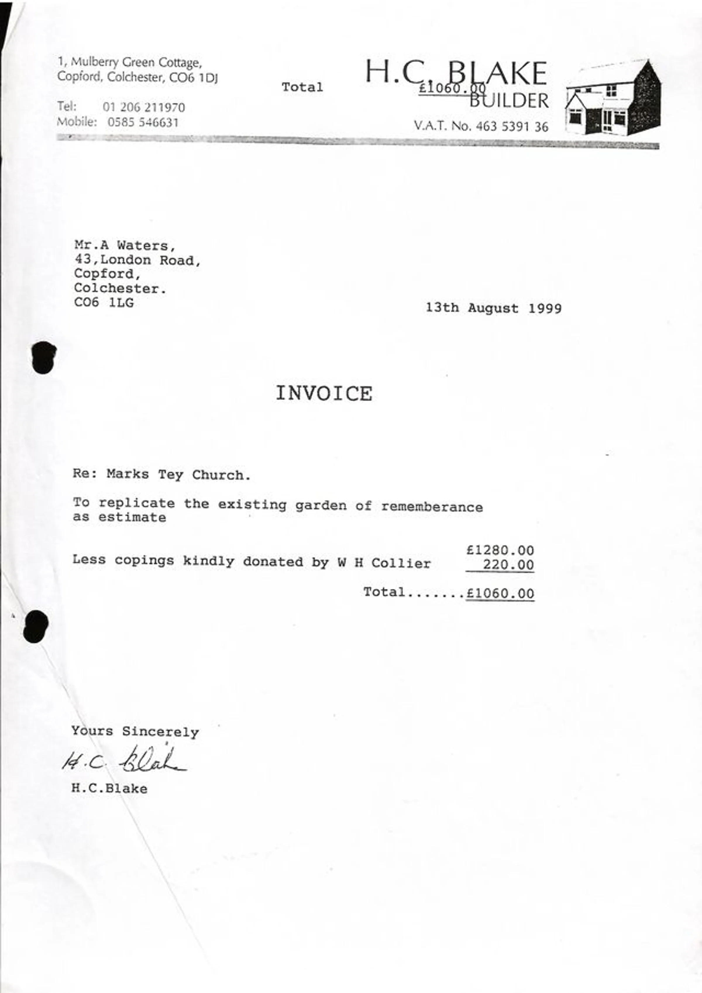 Invoice from H. C. Blake Builder for the construction of a second garden of remembrance in the churchyard of St Andrew's, dated 13th August 1999.