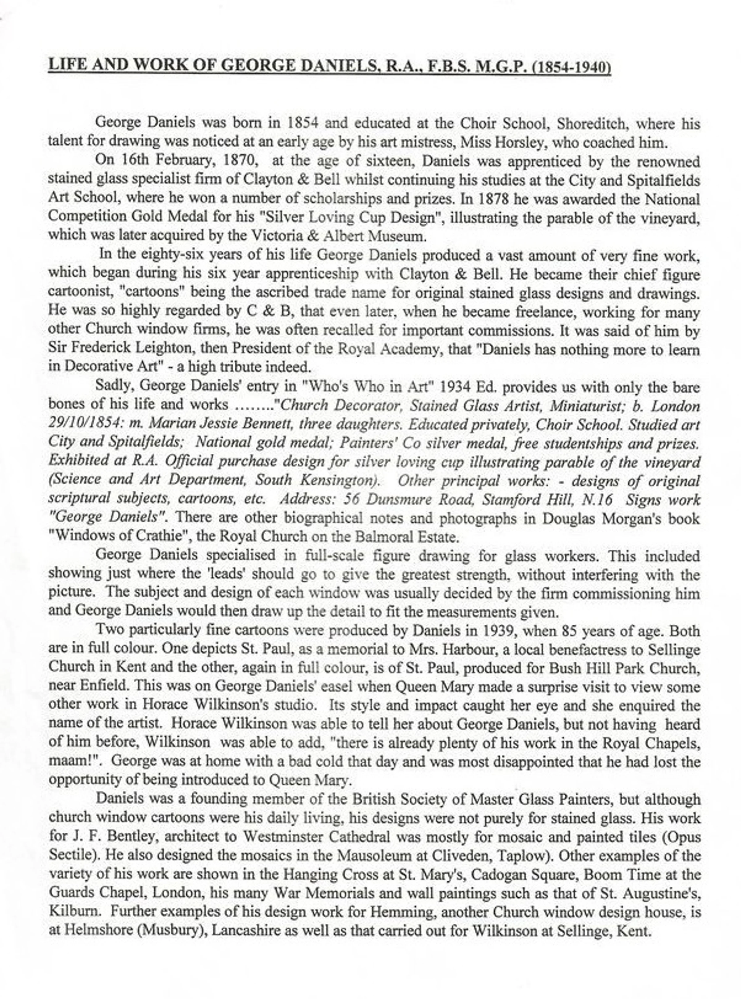 Published biography of George Daniels (1854-1940), the designer of the east window in St Andrew's Church.