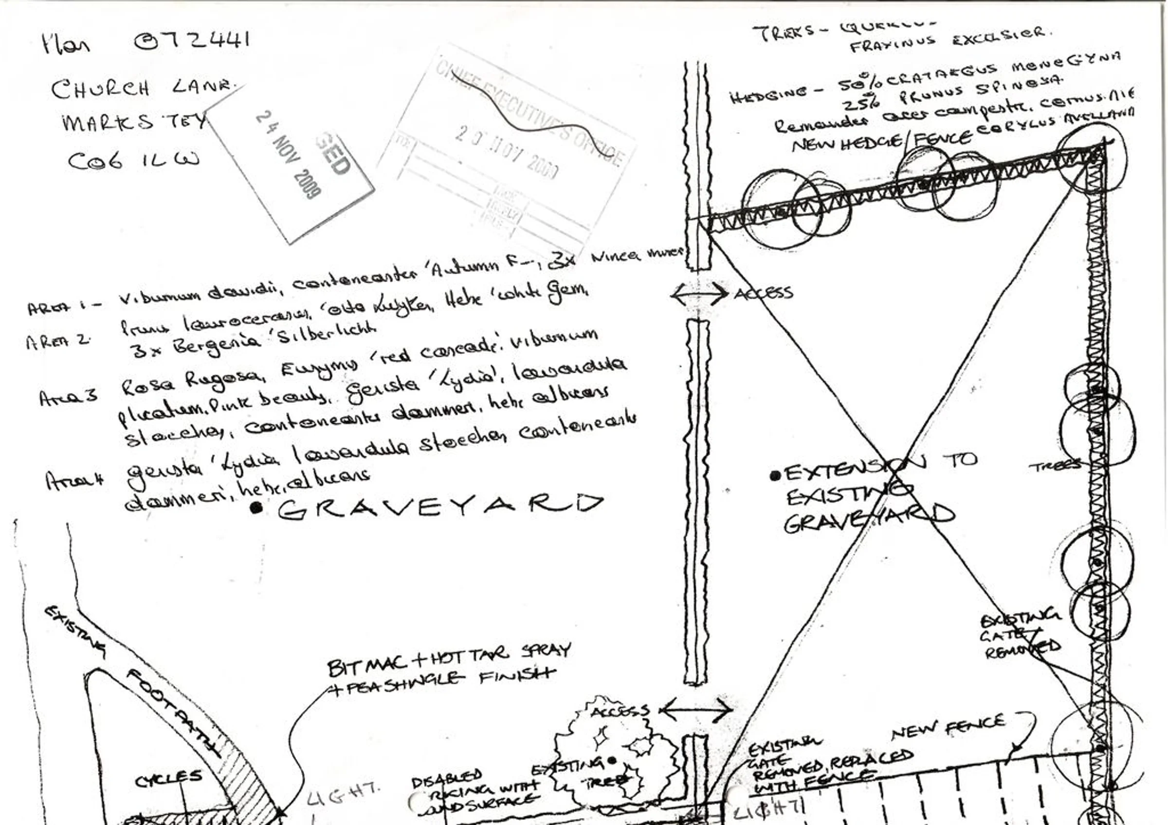 Architect's plan of the graveyard and extension, labelled with hedgerow plants. Approved 24th November 2009. Page 1 of 2.
