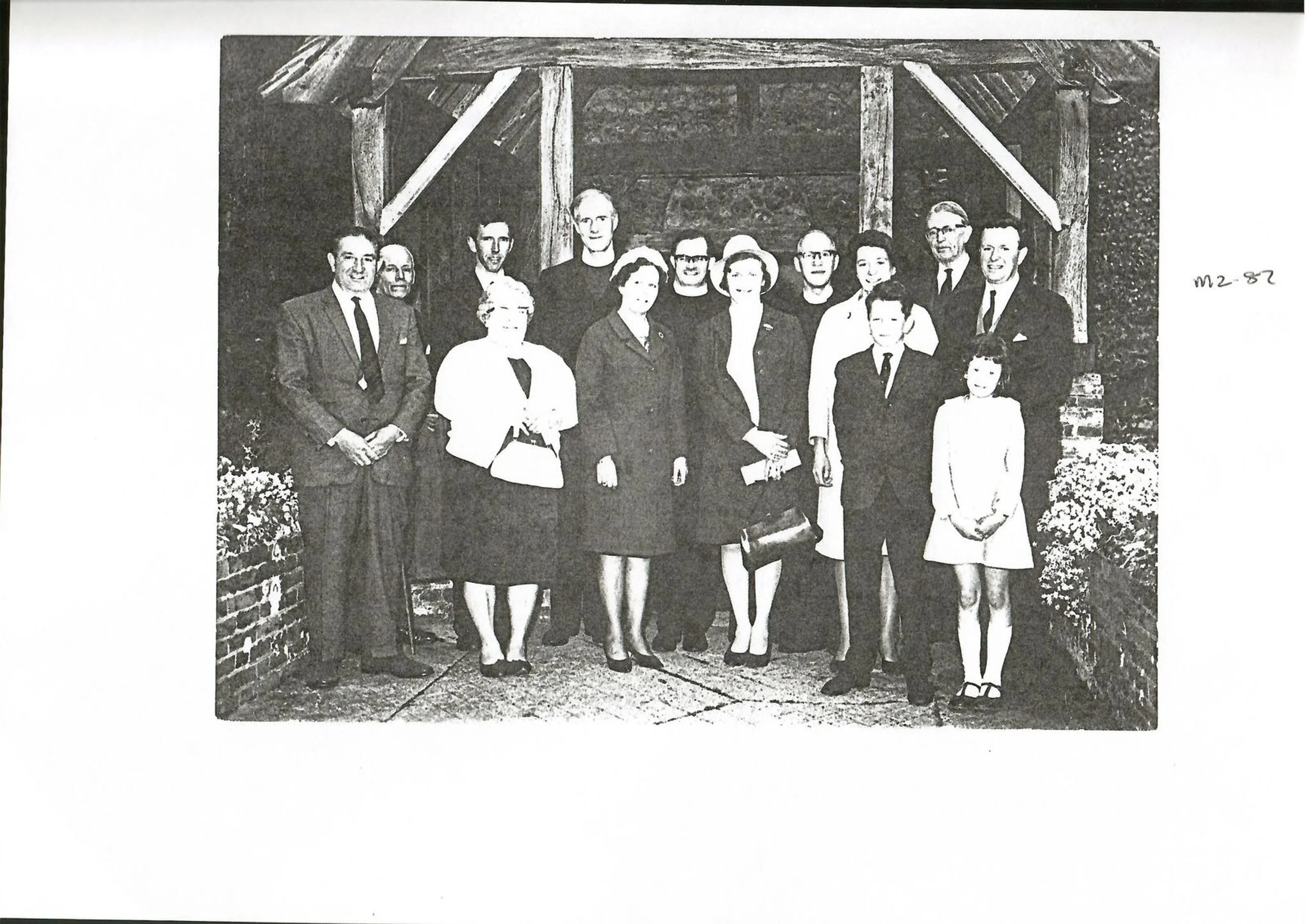 Black and white group photograph at St Andrew's Church porch, including the Bishop of Colchester.