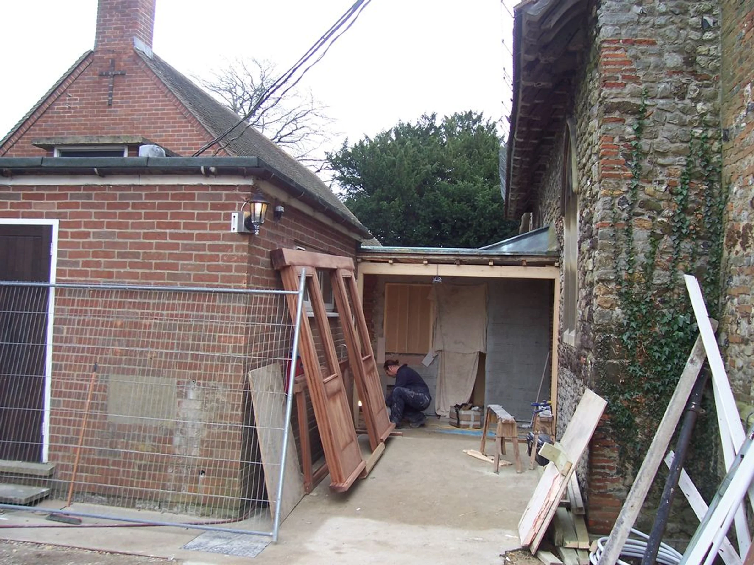 Photograph looking east of work in progress of the installation of the wooden west elevation of the entrance hall, also showing the nave and Church Hall. Taken during teh 2007 reordering.