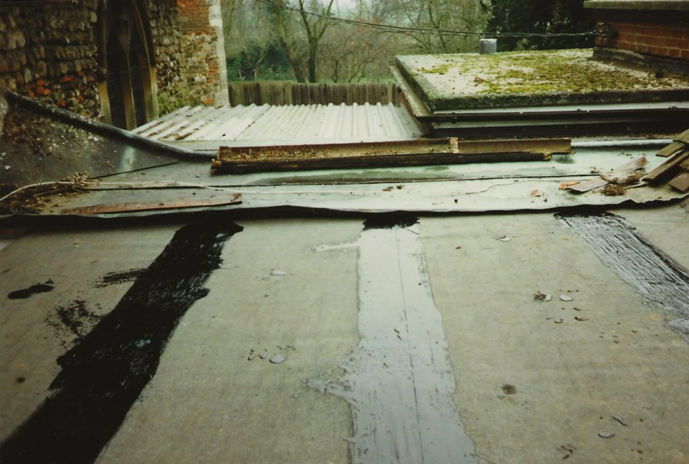 Photograph showing the condition of the roof of the entrance to the Church Hall following a storm, also showing the join with the north nave wall. Unknown date.