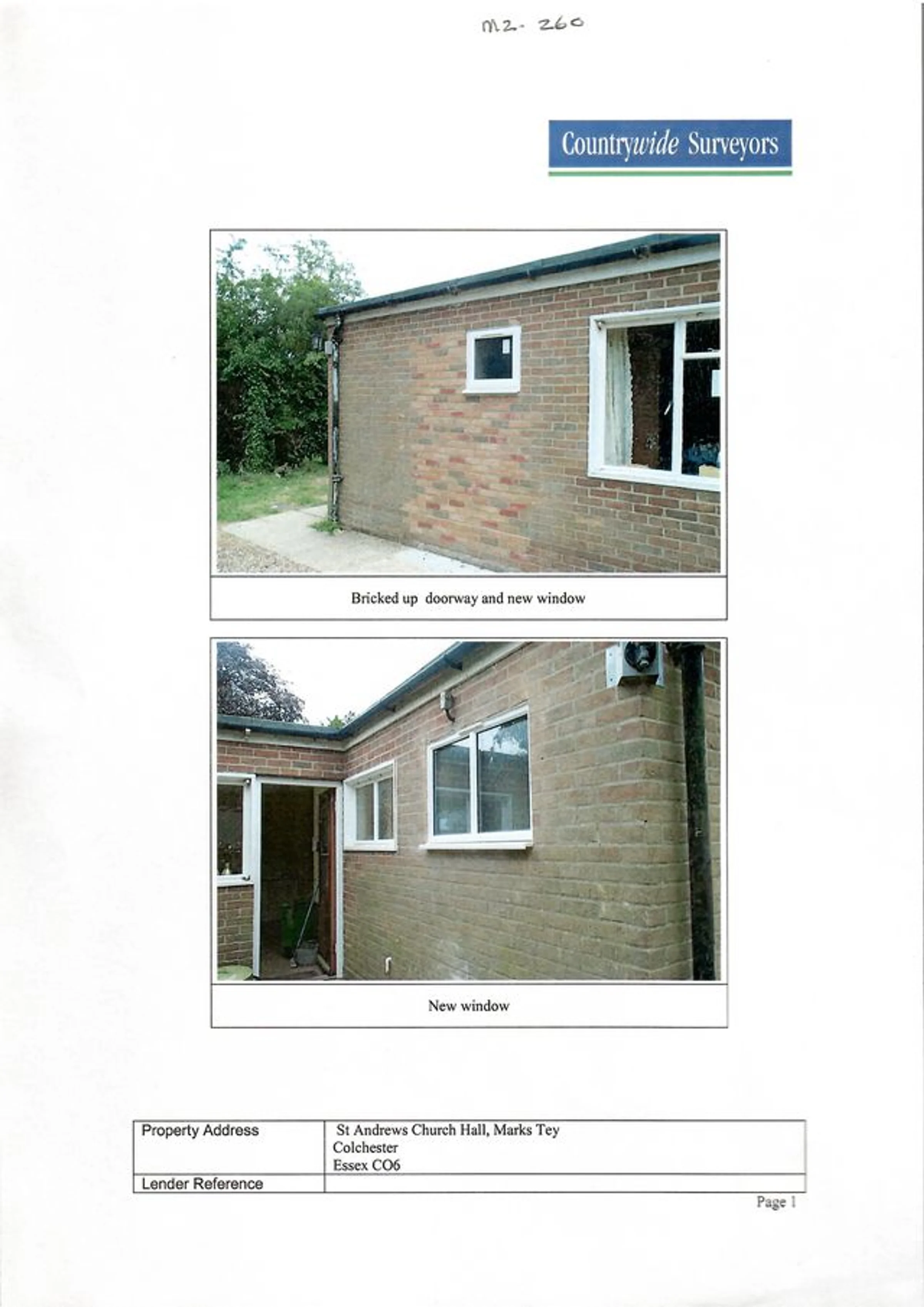Two photographs of the exterior of the hall, one labelled "Bricked up doorway and new window" and the other "New window".