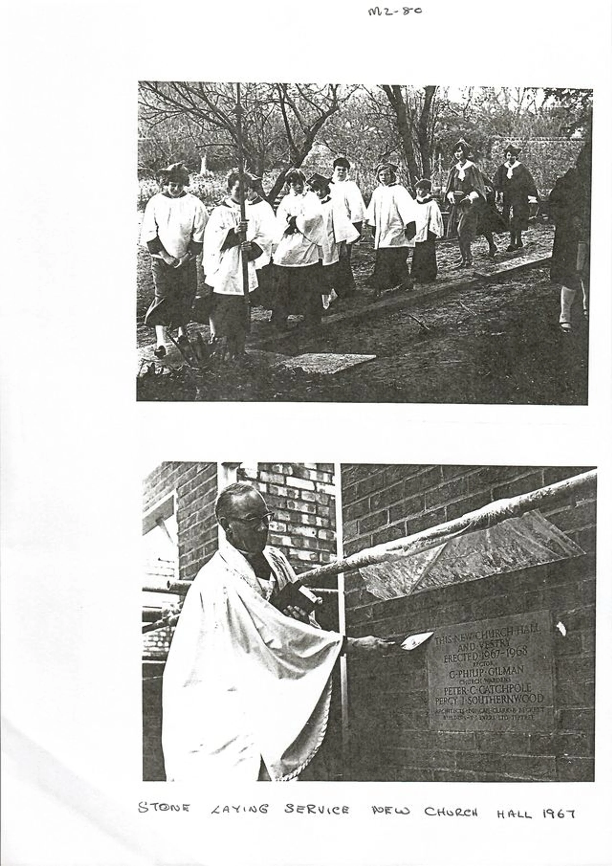 Two black and white photographs of the stone laying service for the Church Hall, 1967.