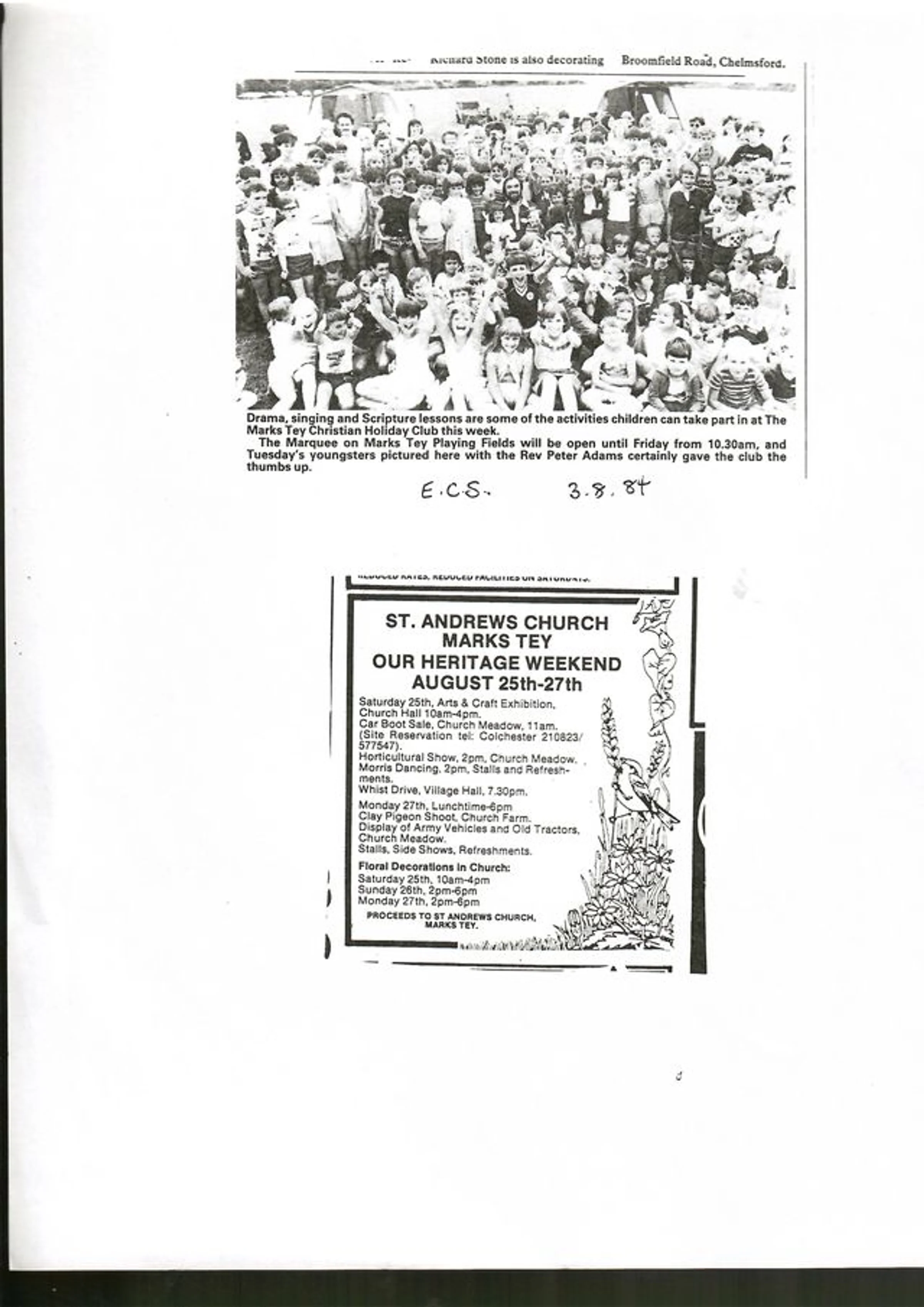 Two short articles, the first advertising Holiday Club with a photograph of a previous year dated 3rd August 1984. The second is an advertisement for the St Andrew's Church Our Heritage Weekend, from the 25th-27th August.