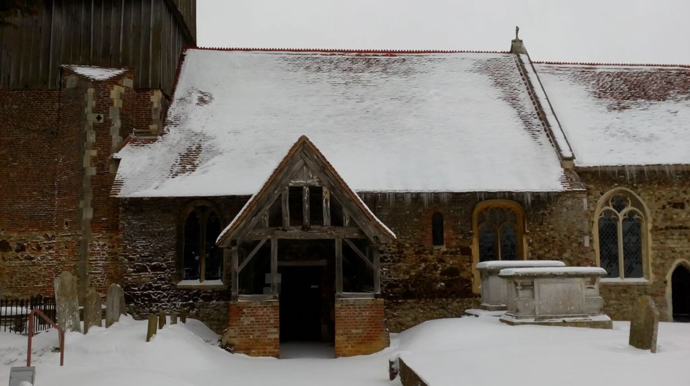 Photograph looking north of the nave and porch in snow, with icicles on the eaves drip.