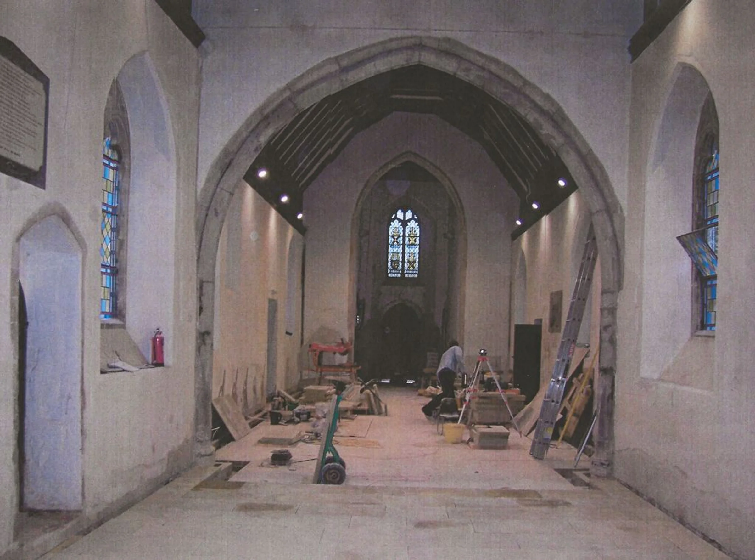 Photograph looking west from the sanctuary of the installation of the stone floor with the chancel complete, during 2007 reordering.