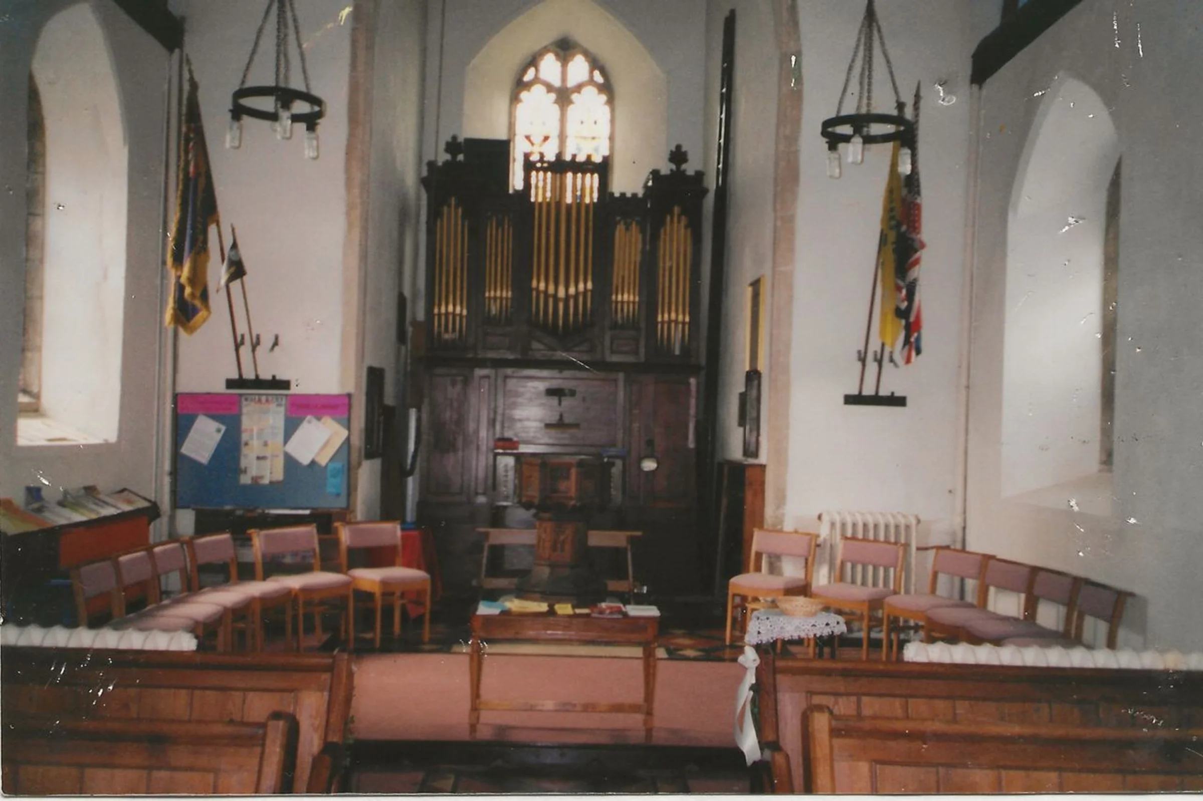 Photograph of the interior of St Andrew's Church looking west, showing the organ and font.