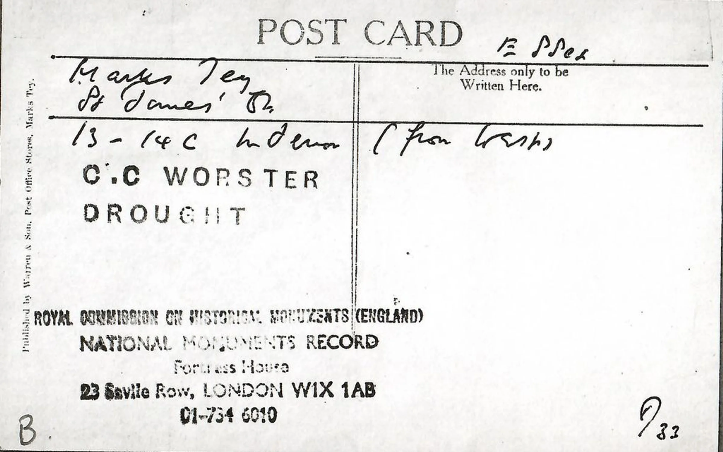 Reverse of the black and white postcard held by the National Monuments Record of the "Interior, Marks Tey Church".