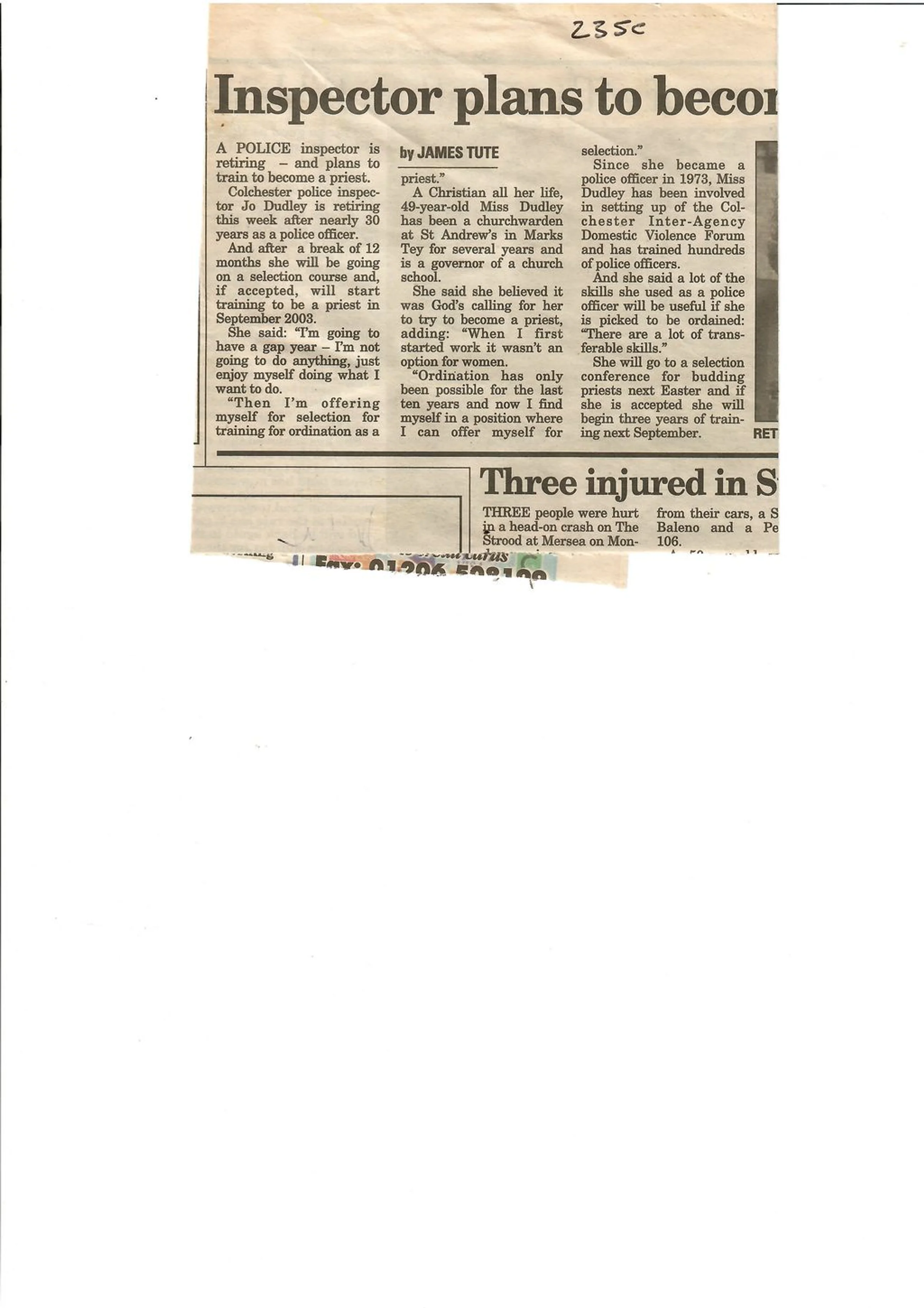 Article on Jo Dudley planning on training to be a priest.