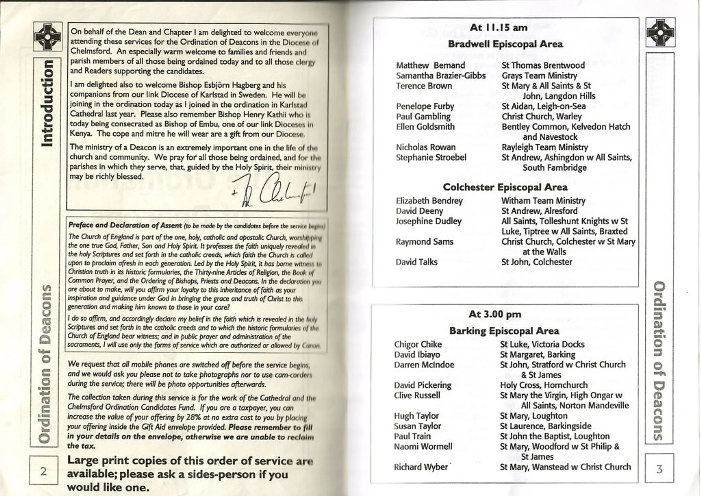 Service sheet for the Ordination of Deacons, including Jo Dudley, July 2006.