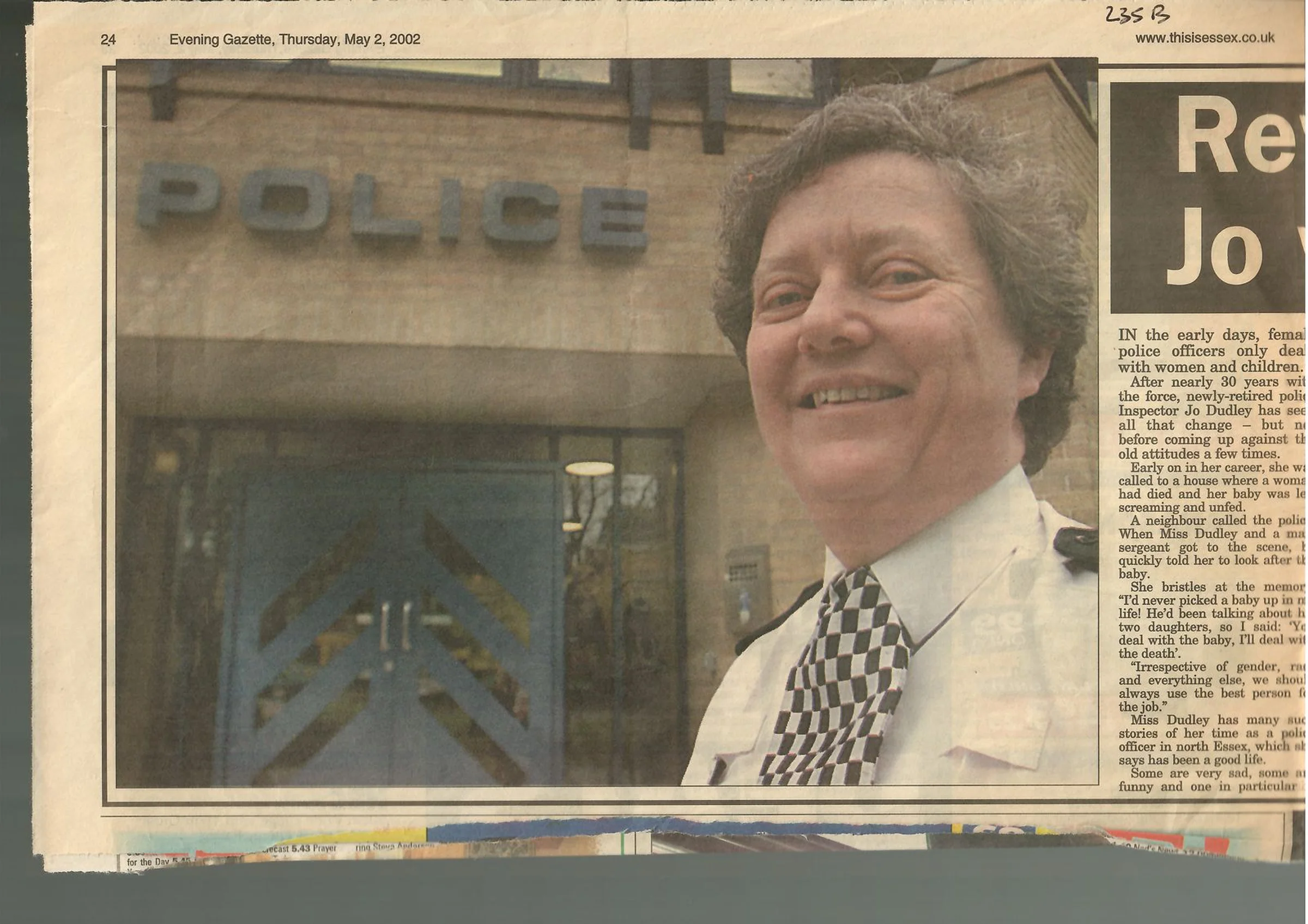 Photograph and article about the retirement of Inspector Jo Dudley and plans to become a priest, 2002. Page 1 of 2.
