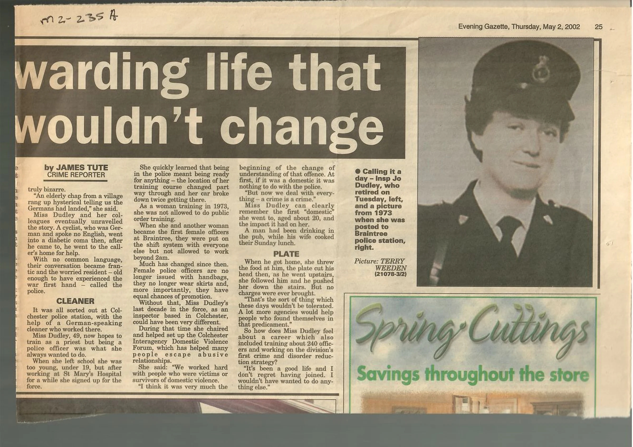 Photograph and article about the retirement of Inspector Jo Dudley and plans to become a priest, 2002. Page 2 of 2.