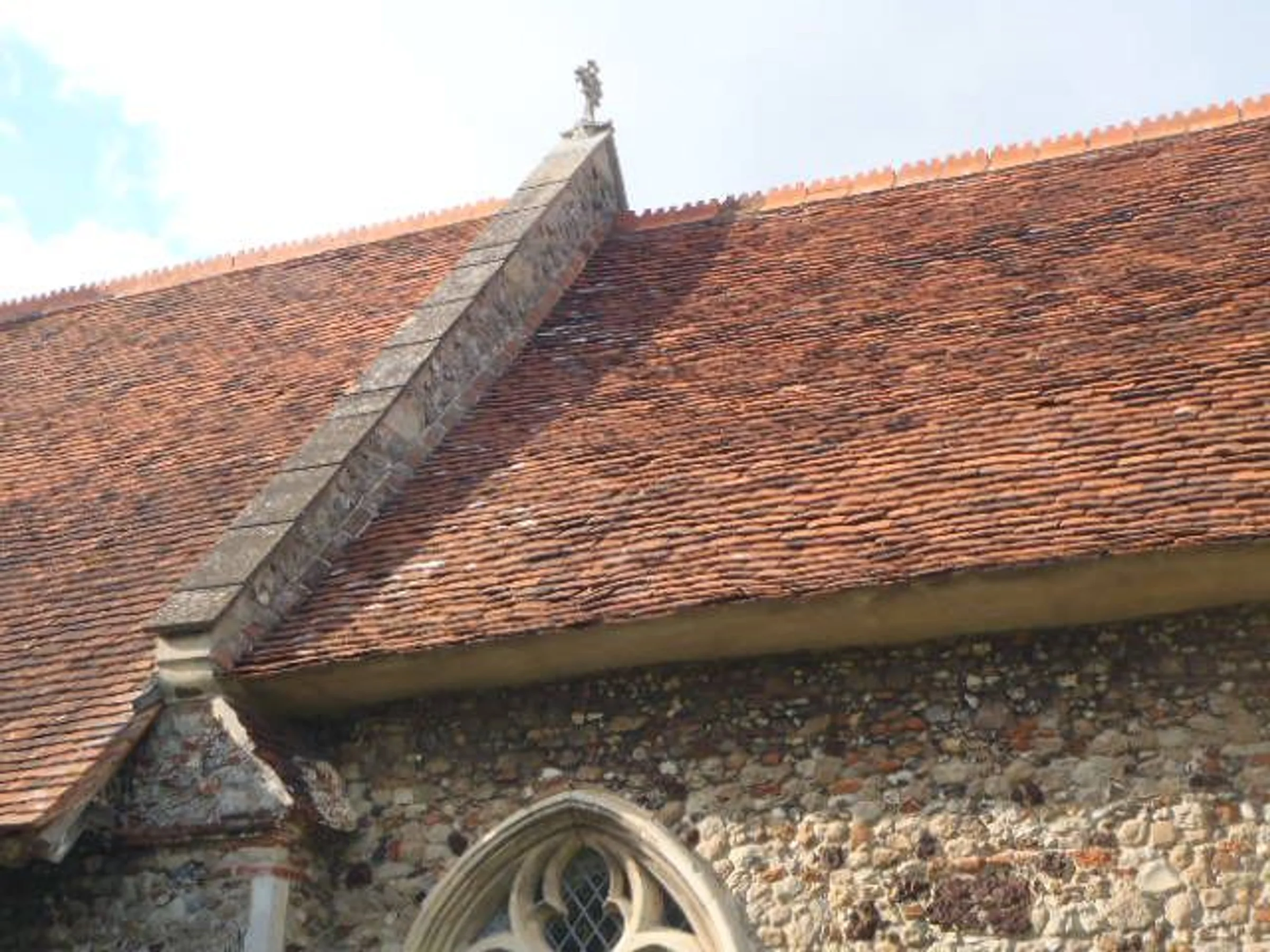 Close up photograph looking north of the join between the chancel roof and nave at St Andrew's Church.
