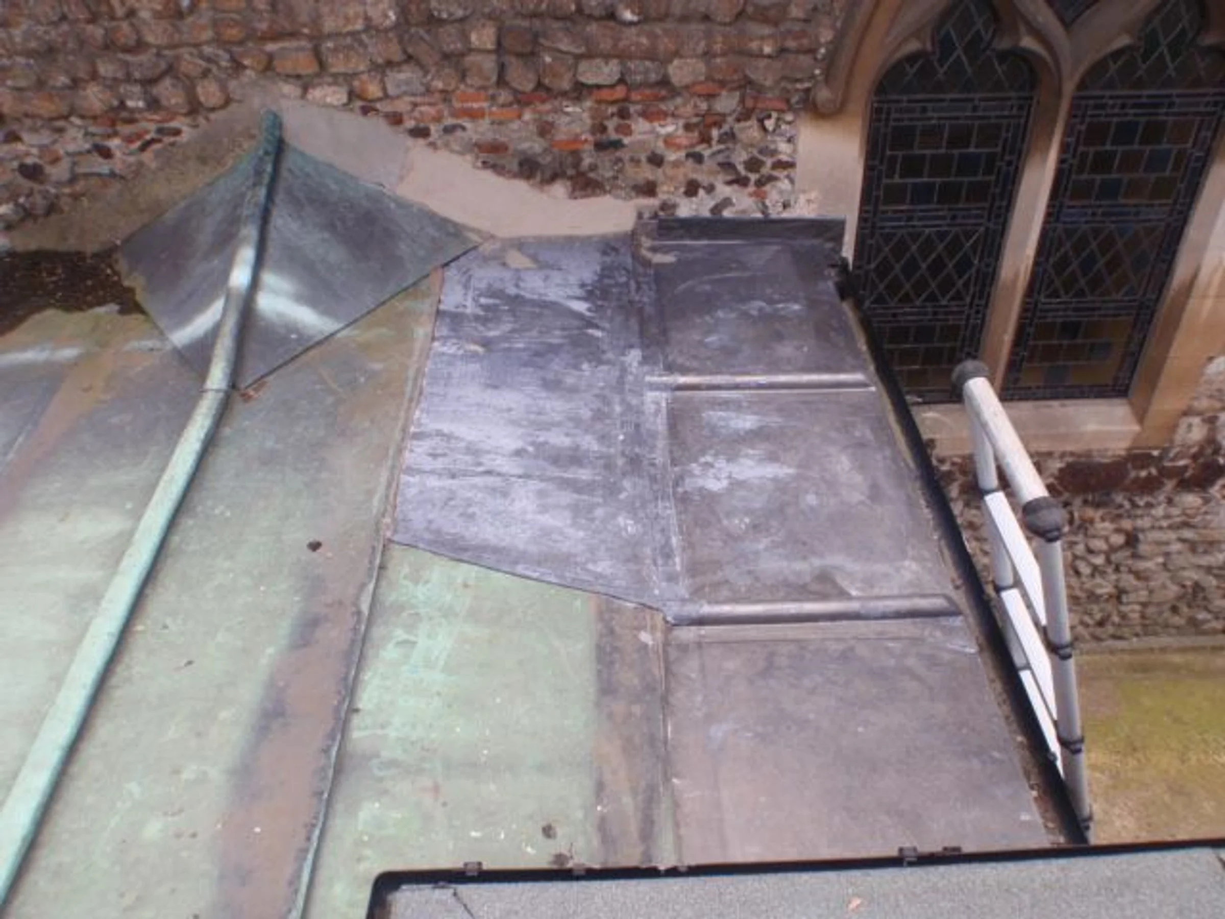 Photograph looking south of the lead roof of the entrance to the Church Hall with the nave wall and stained glass.