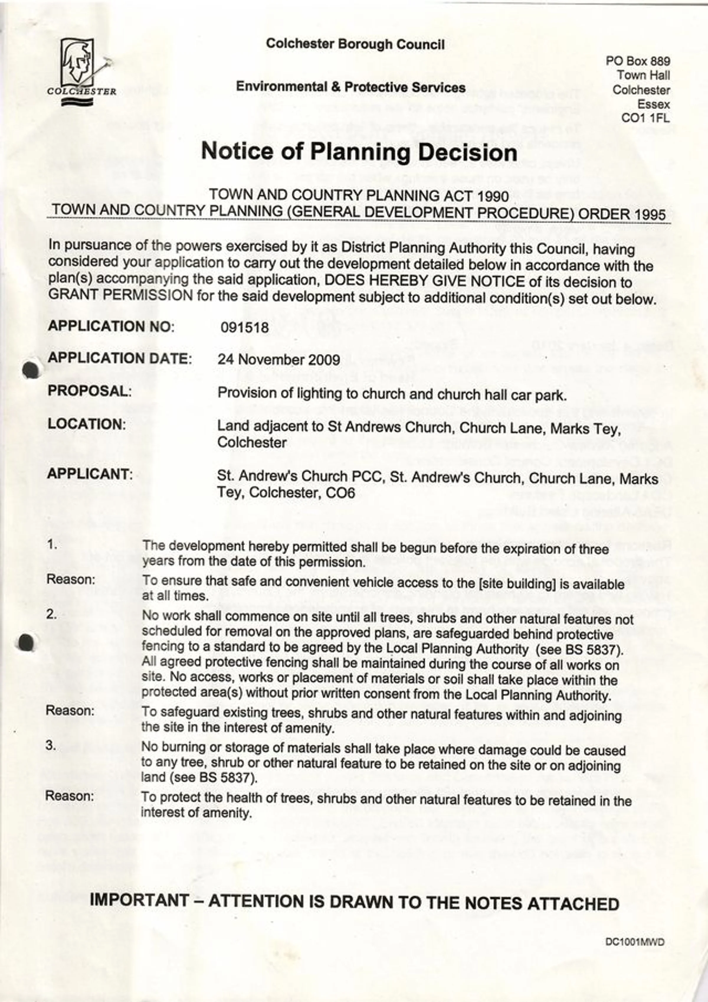 Planning decision notice of decision to grant planning permission to install lighting to the church car park, by Colchester Borough Council. Dated January 2010, application date 24th November 2009.