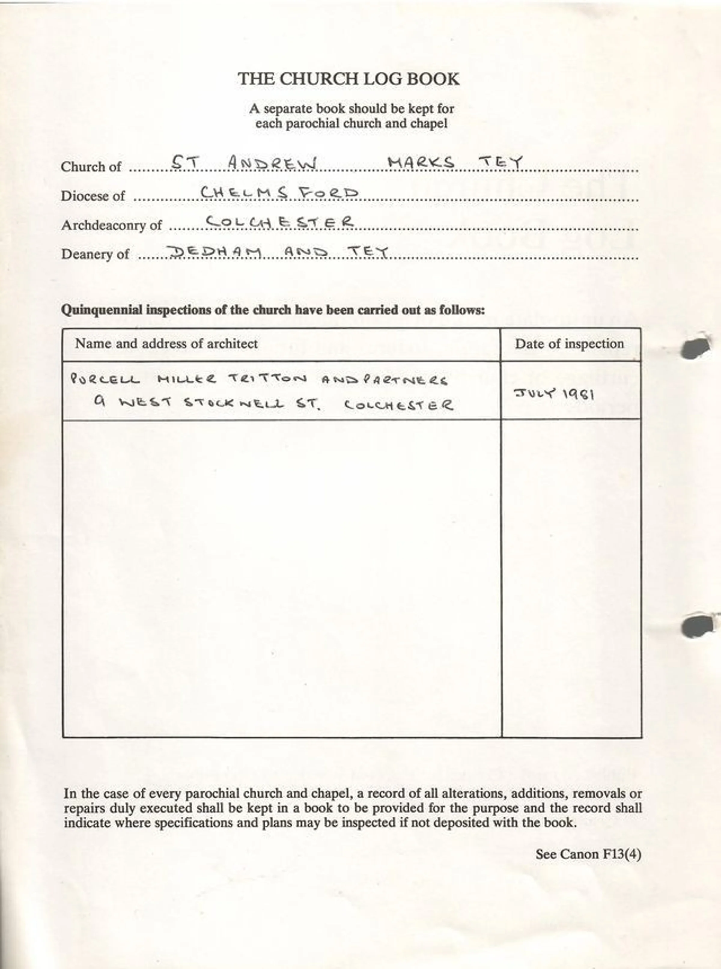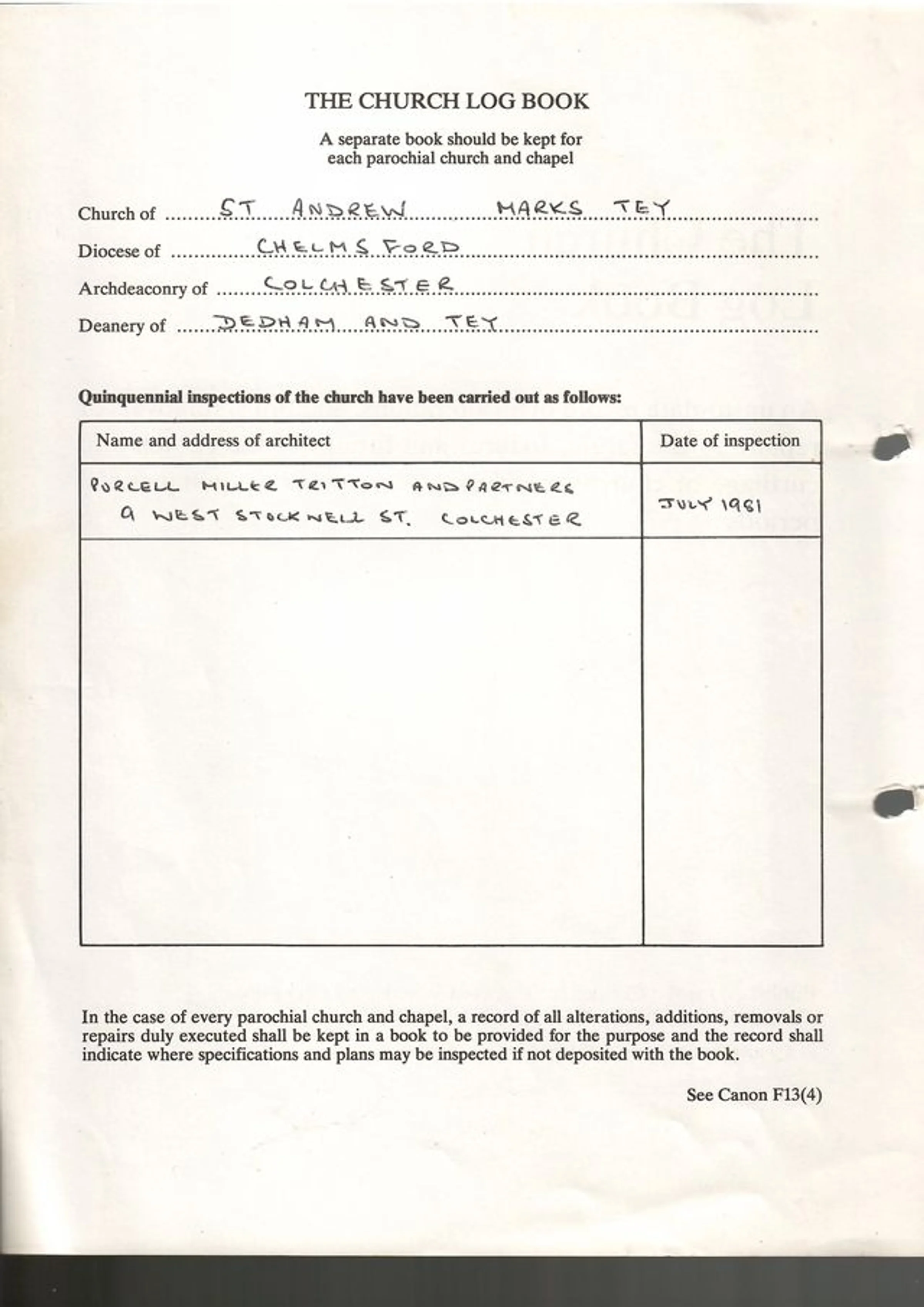 Church Log Book entry regarding Quinquennial inspection by Purcell Miller Tritton and Partners, July 1981.