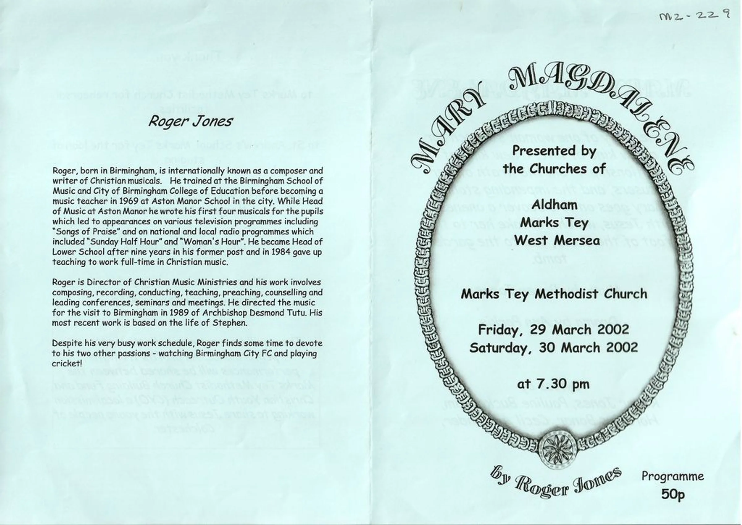 Concert programme from a performance of Mary Magdelene, by churches of Aldham, Marks Tey and West Mersea, 29th-30th March 2002. Page 1 of 4.