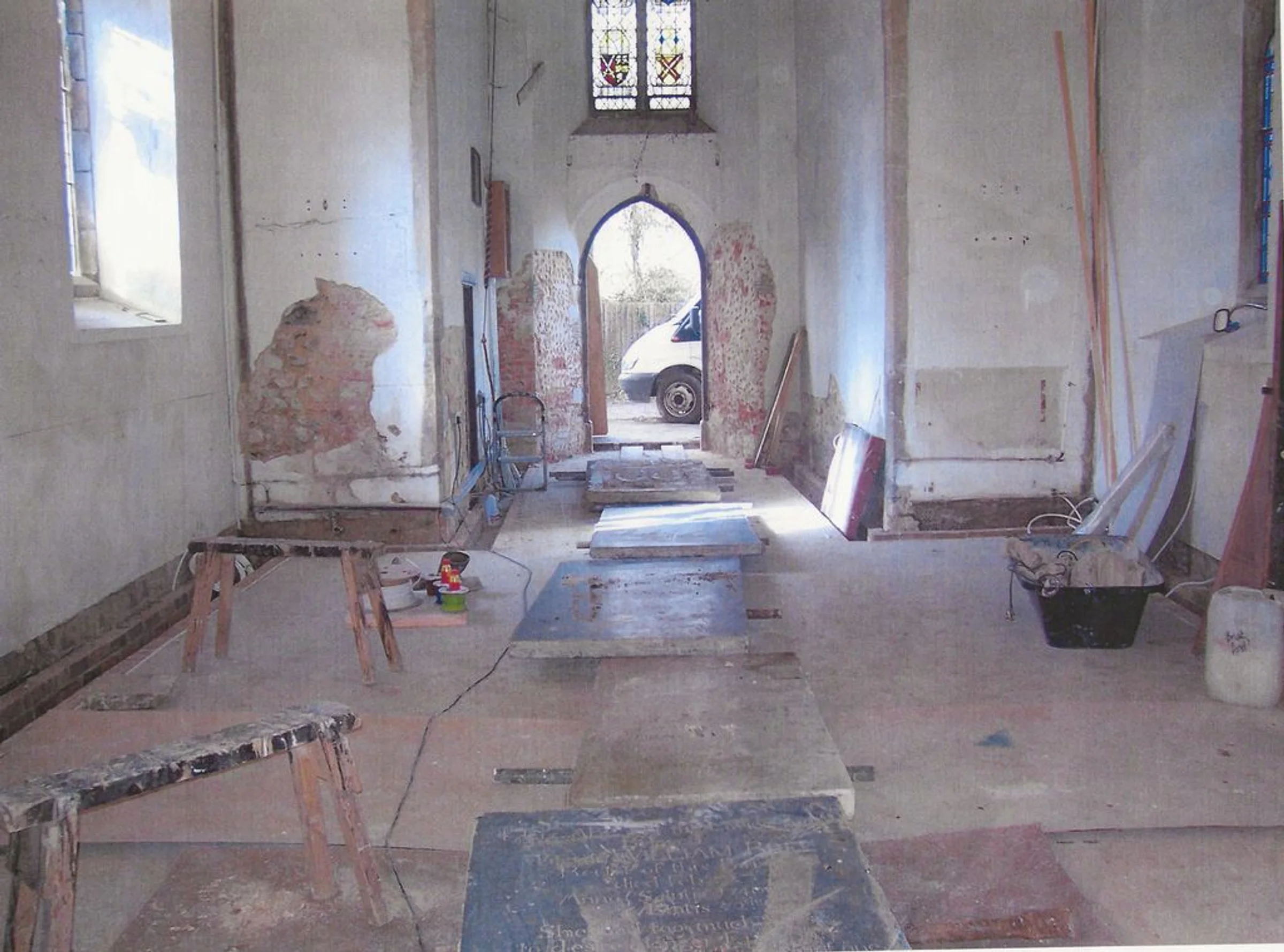Photograph looking west of the stone grave plaques from the sanctuary being moved back into the church through the west door, during 2007 reordering.
