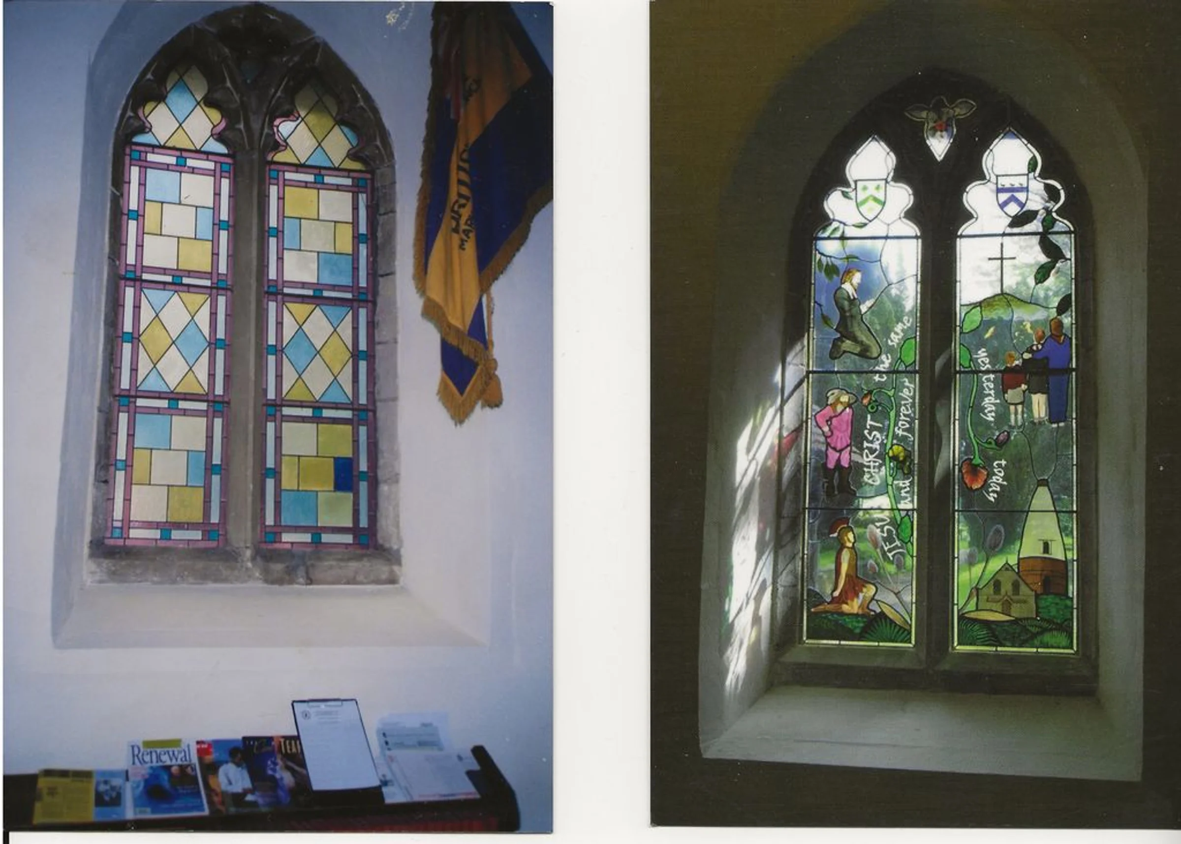 Two photographs showing a before and after of the Millennium window in St Andrew's Church.