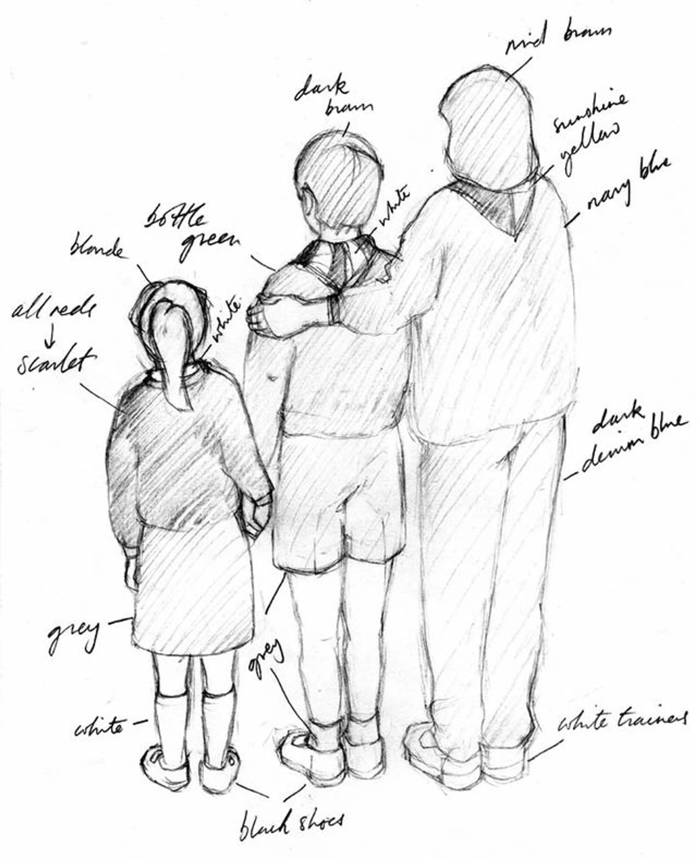 Detail of a sketch for the Millennium Window showing a school child, Scout and Guide. By Ros Draw.