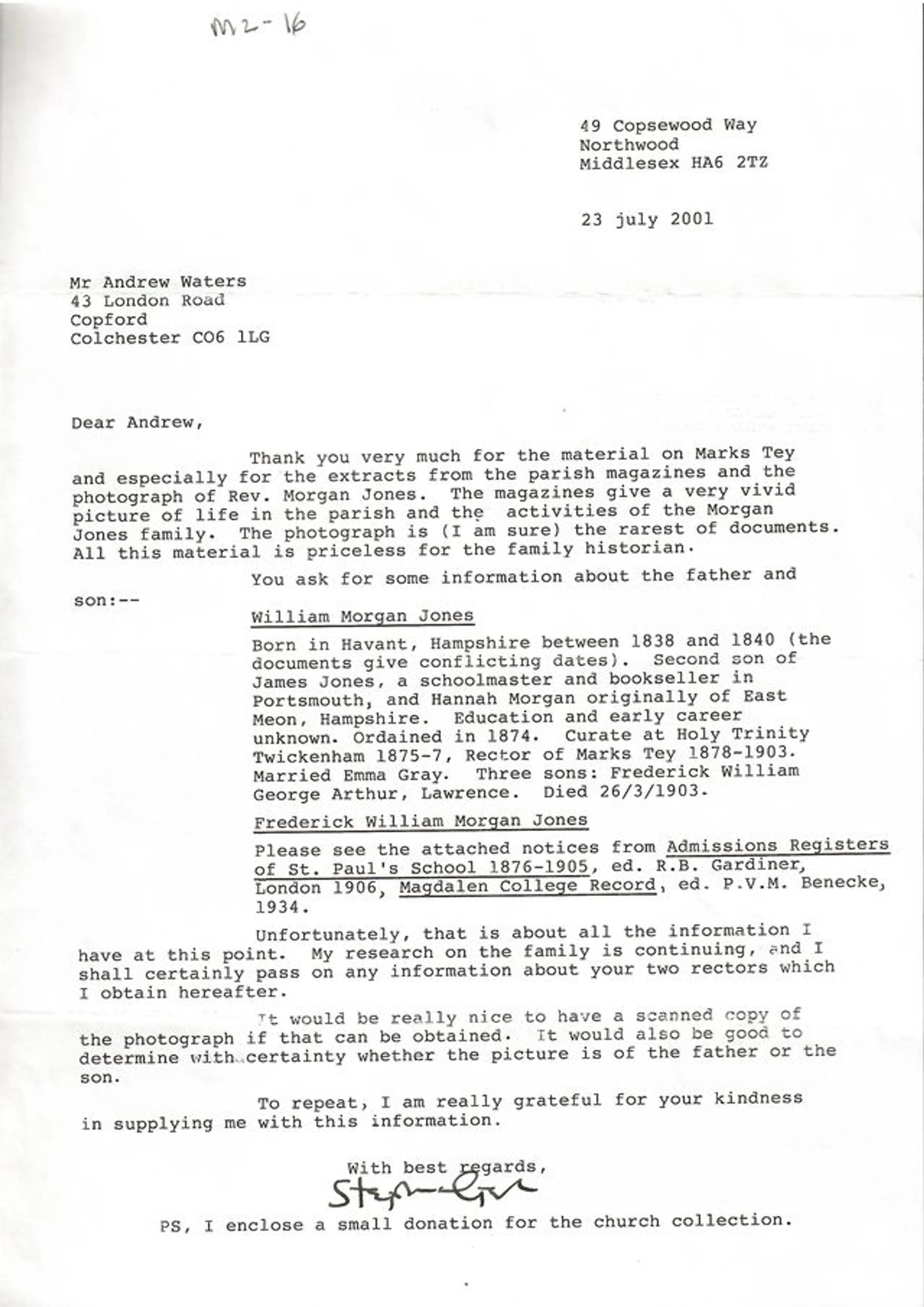 Letter to Andrew Waters from Stephen Gersh regarding William and Frederick William Morgan Jones, dated 23rd July 2001.