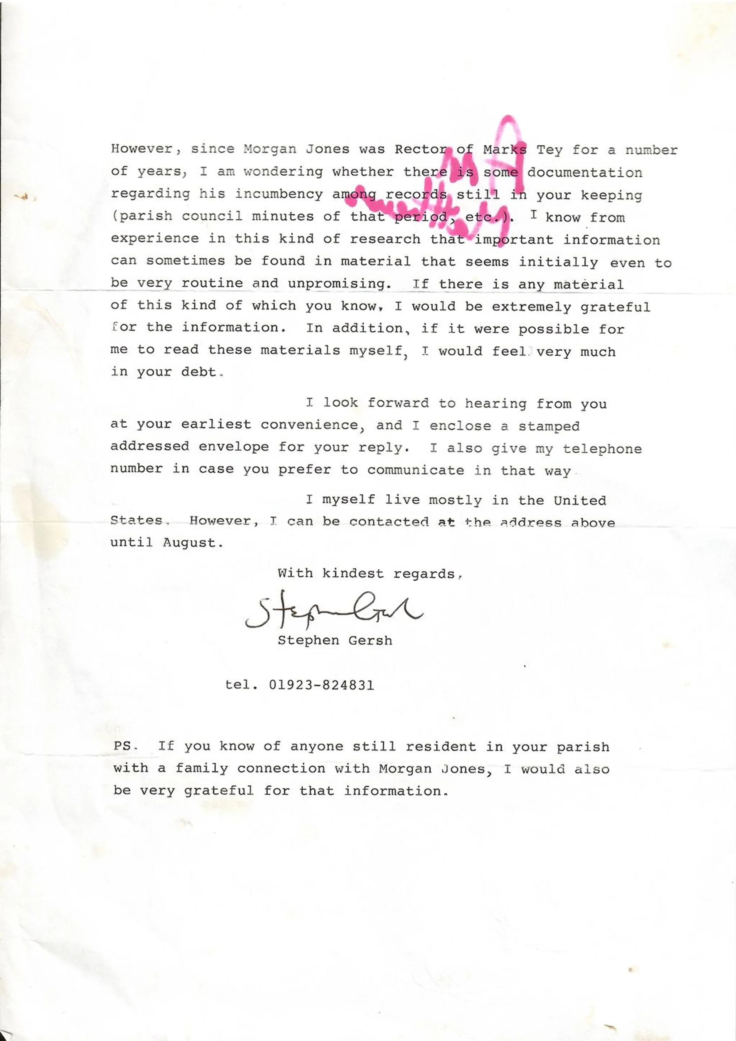 Letter to Rev Stephen Nuth from Stephen Gersh regarding William and Frederick William Morgan Jones, dated 14th June 2001. Page 2 of 2.