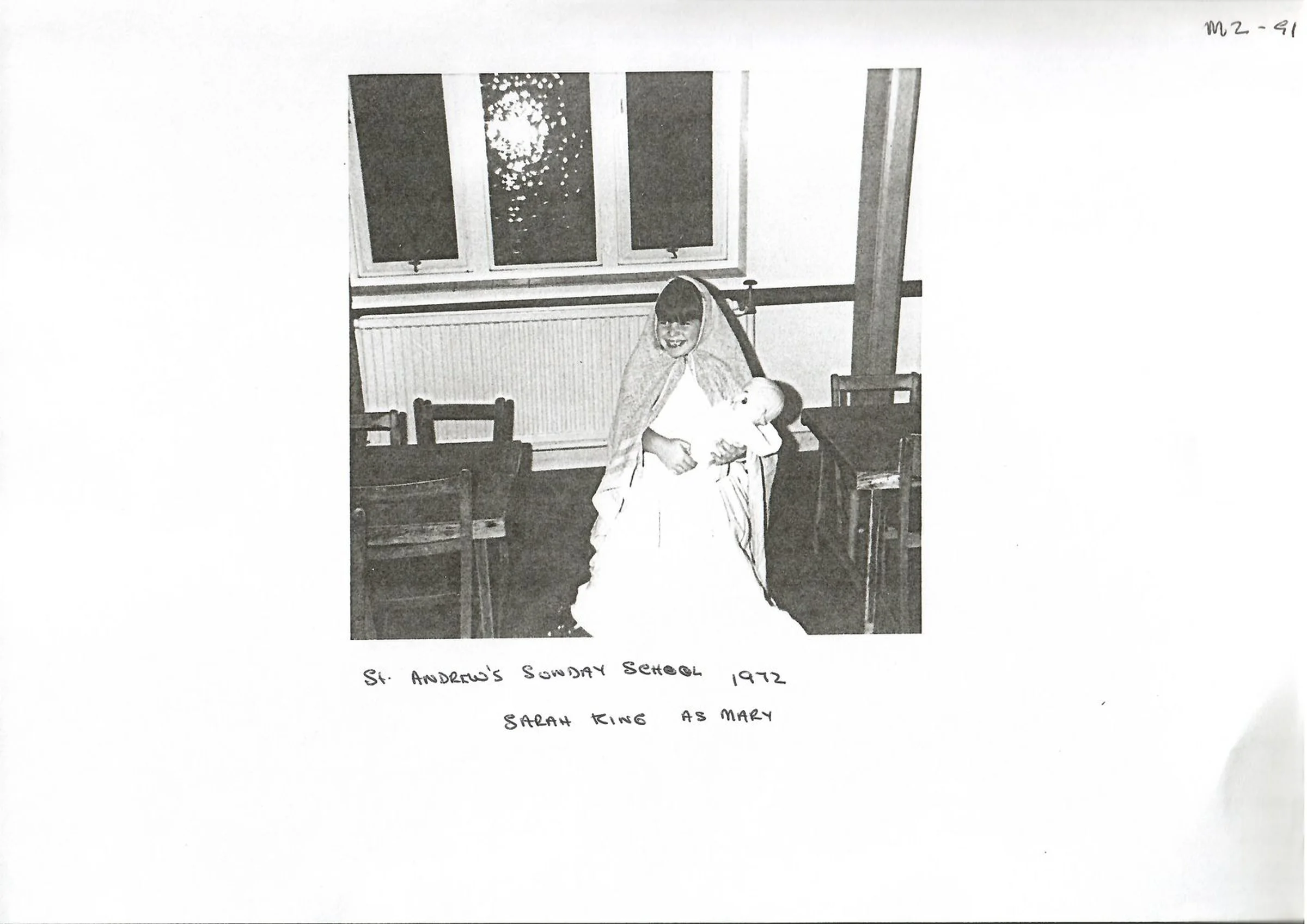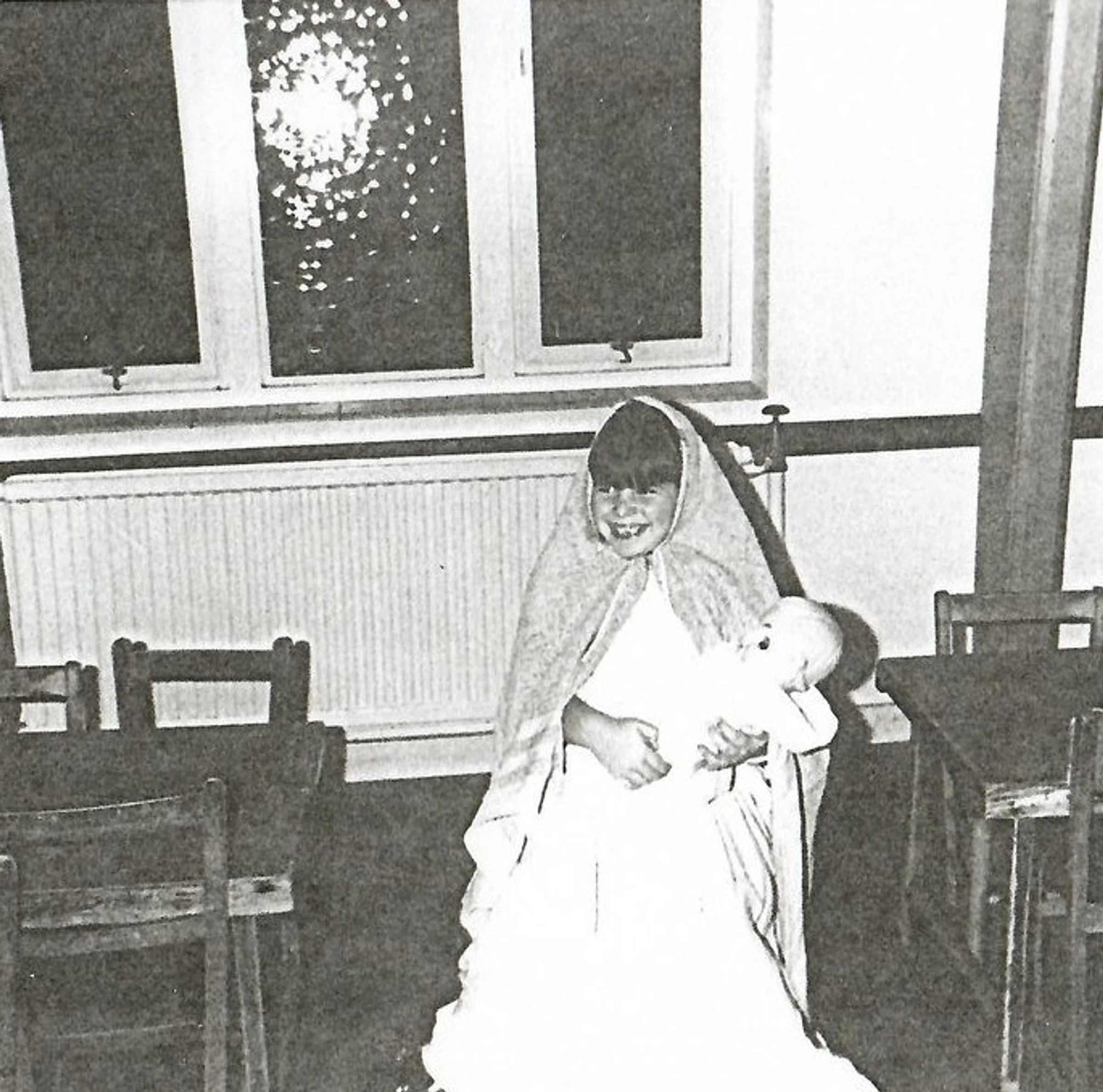 Black and white photograph of Sarah King as Mary in the Sunday School nativity, 1972.