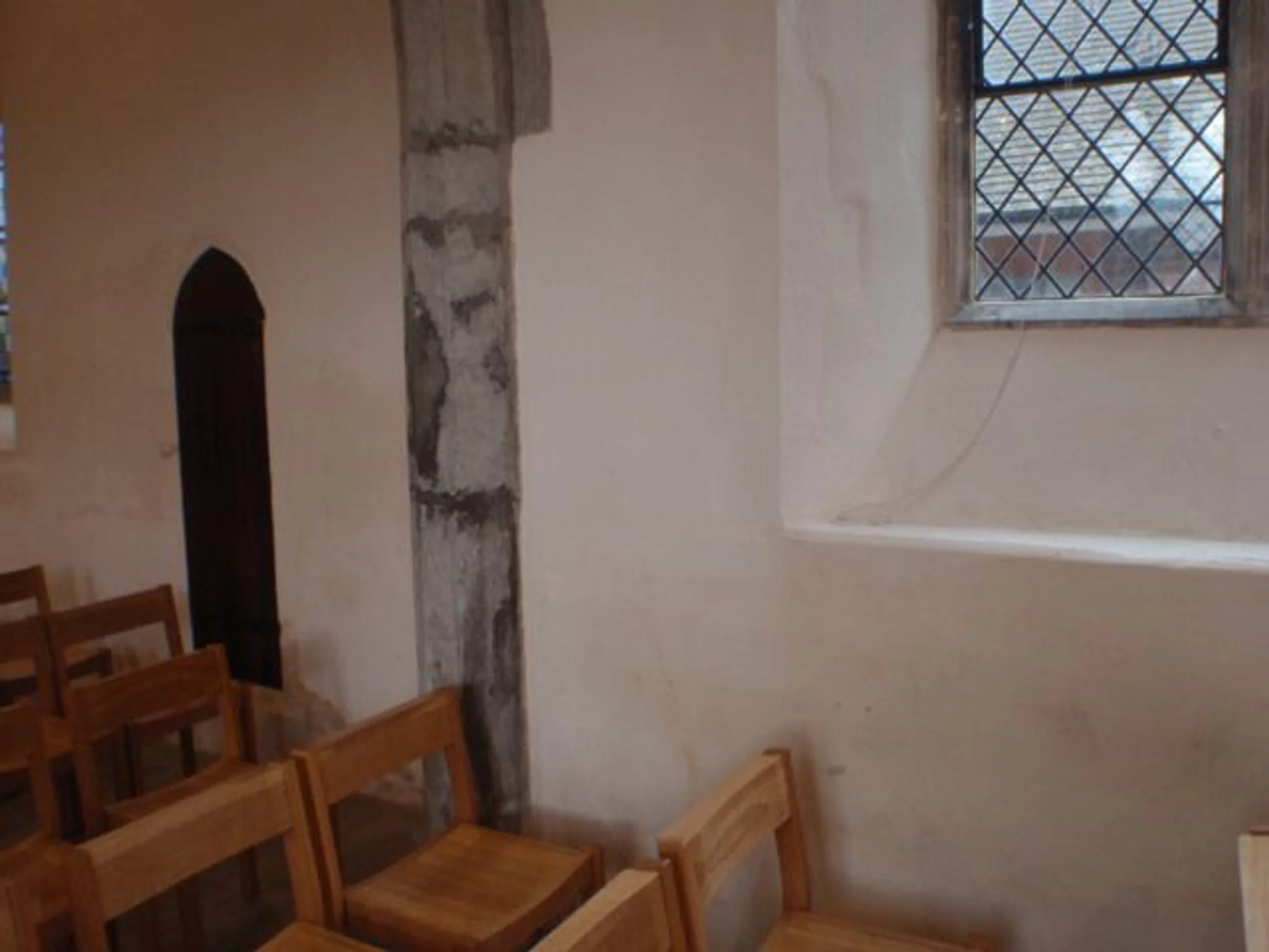 Photograph of interior of nave wall and window looking towards church hall. Before the reordering.