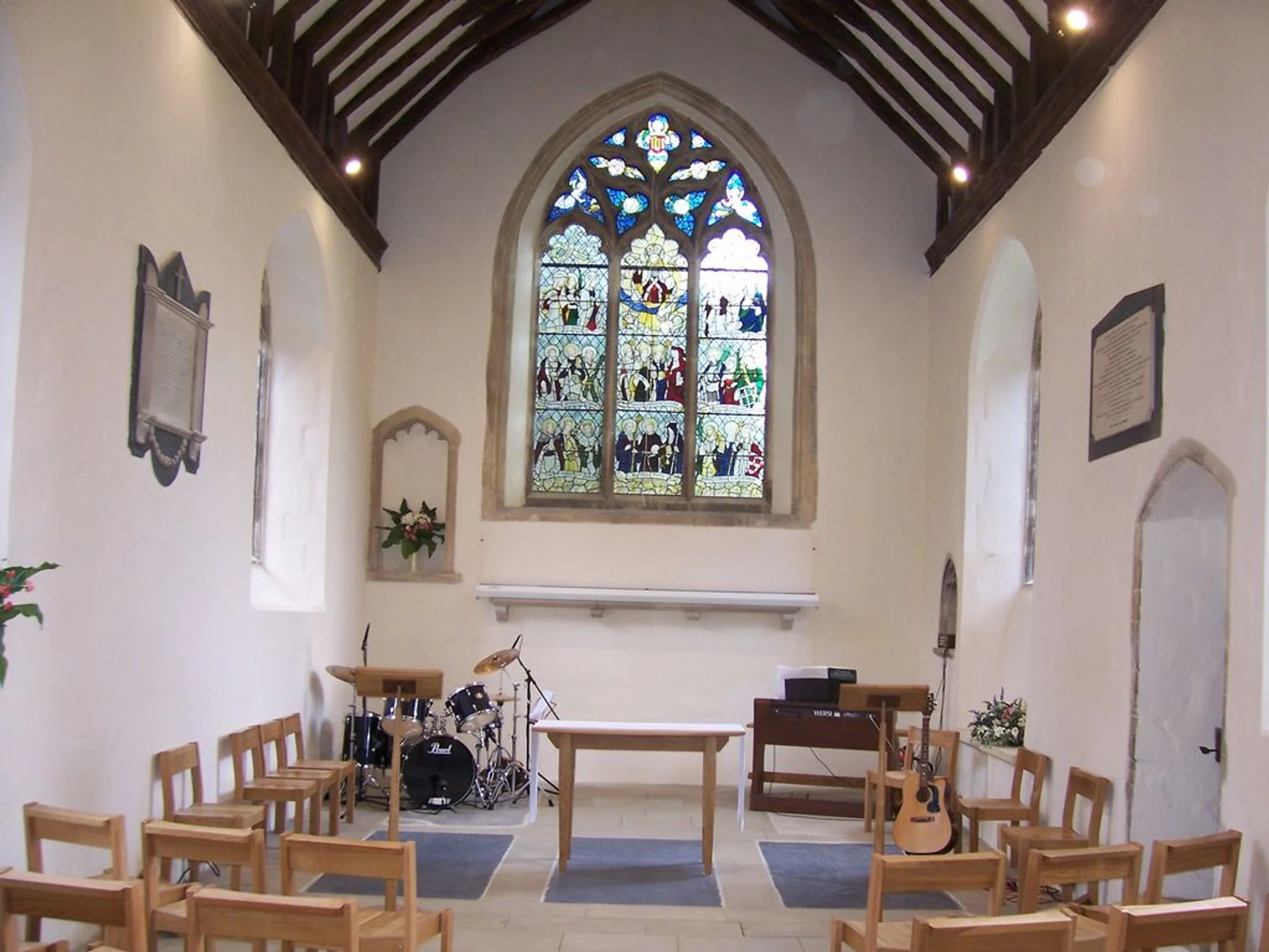 Photograph taken looking east of the completed reordering of the chancel, with instruments. During 2007 reordering.