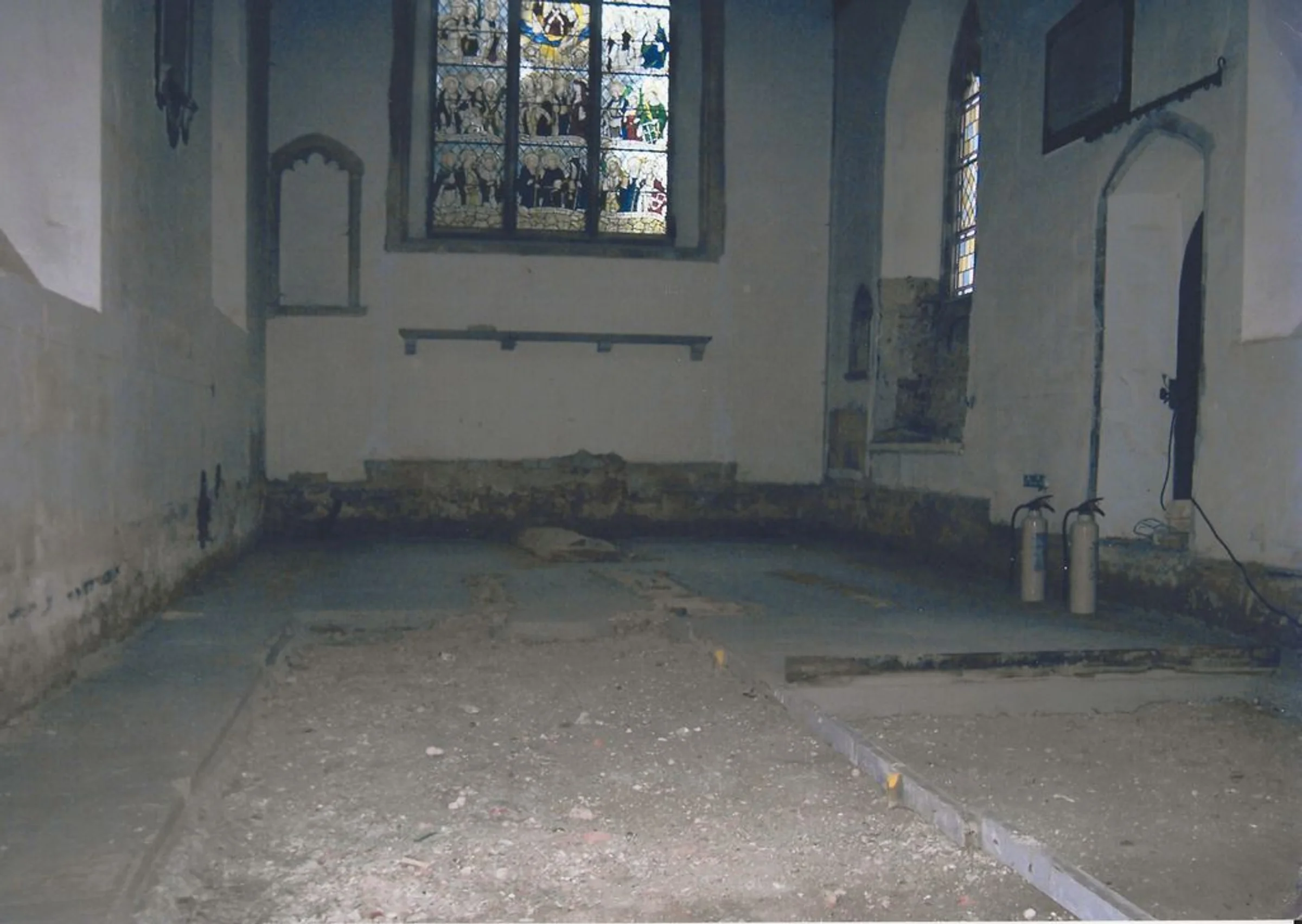 Photograph looking east of the new chancel floor being installed to the correct level, during 2007 reordering.