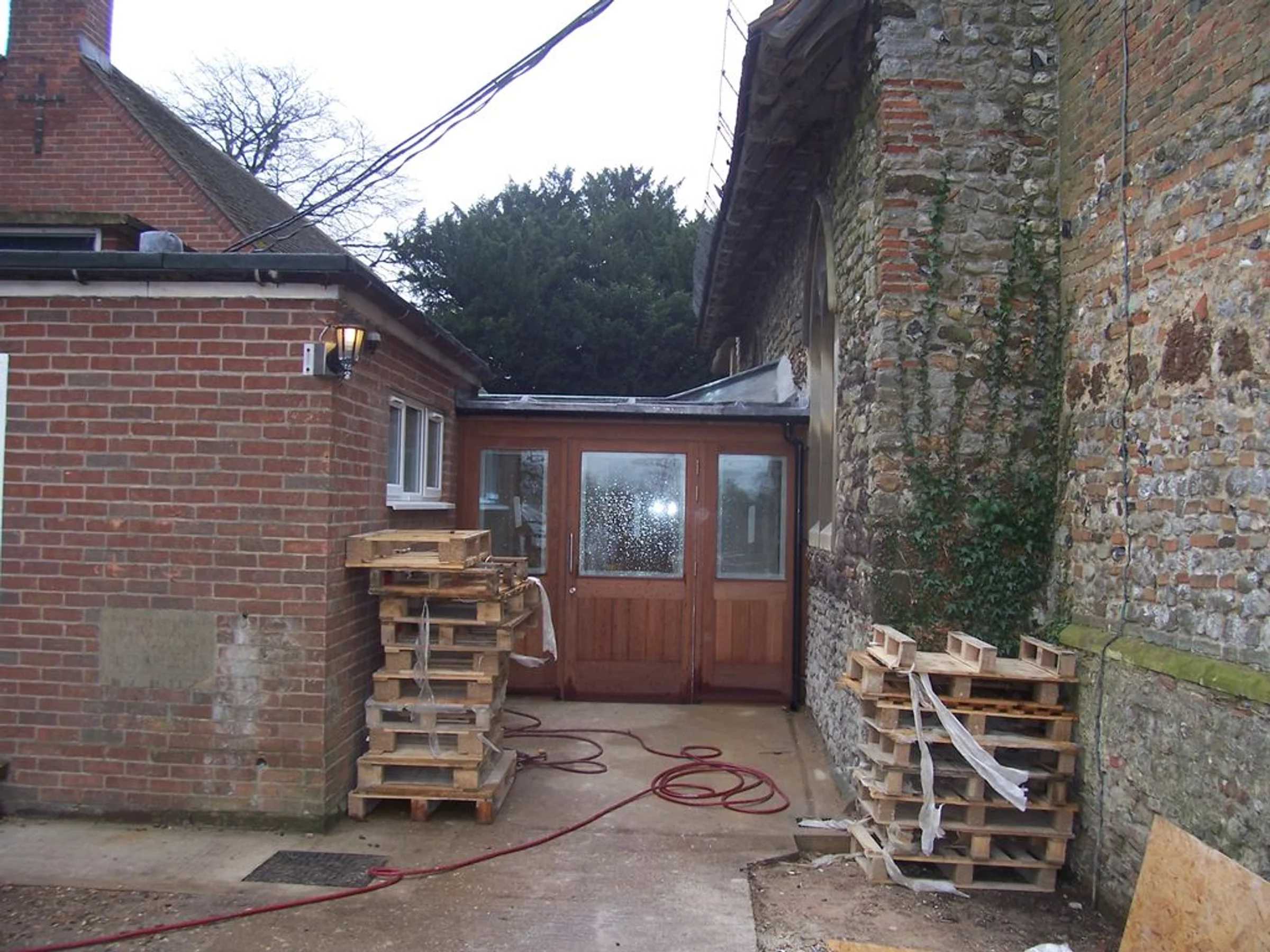 Photograph looking east of the new wooden western elevation of the entrance to the hall and vestry, also showing the nave and Church Hall. Taken during the 2007 reordering.