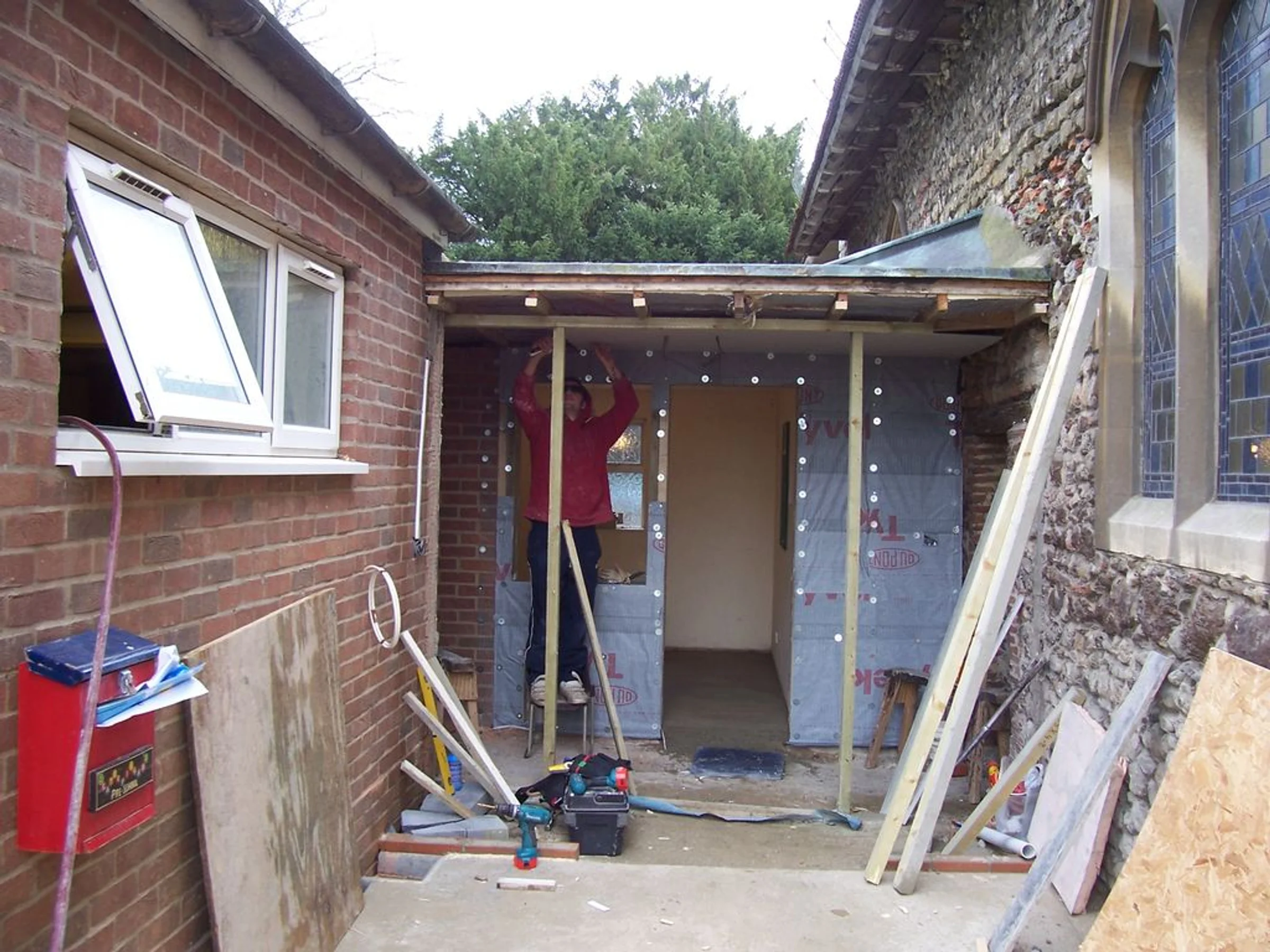 Photograph looking east of work on the hall entrance in progress, west elevation removed. Taken during the 2007 reordering.