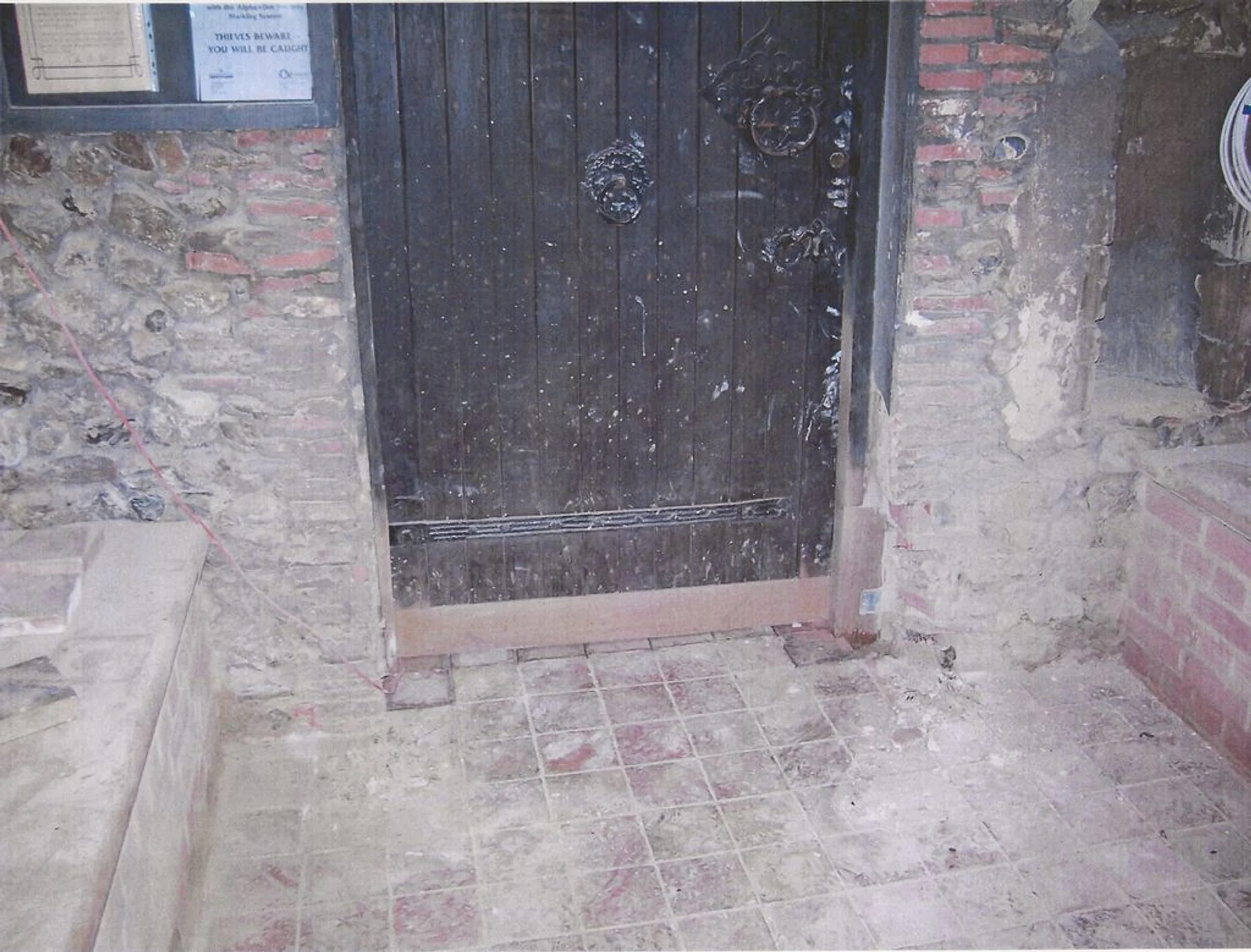 Photograph of the newly installed porch floor tiles looking towards the south door, during 2007 reordering.
