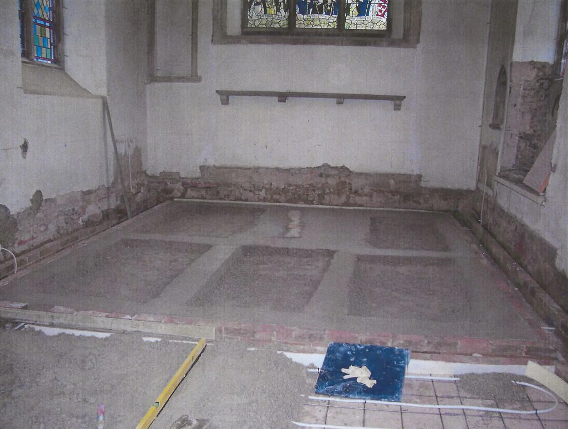 Photograph looking east of the floor in the sanctuary levelled over the graves prior to the installation of underfloor heating, during the 2007 reordering.