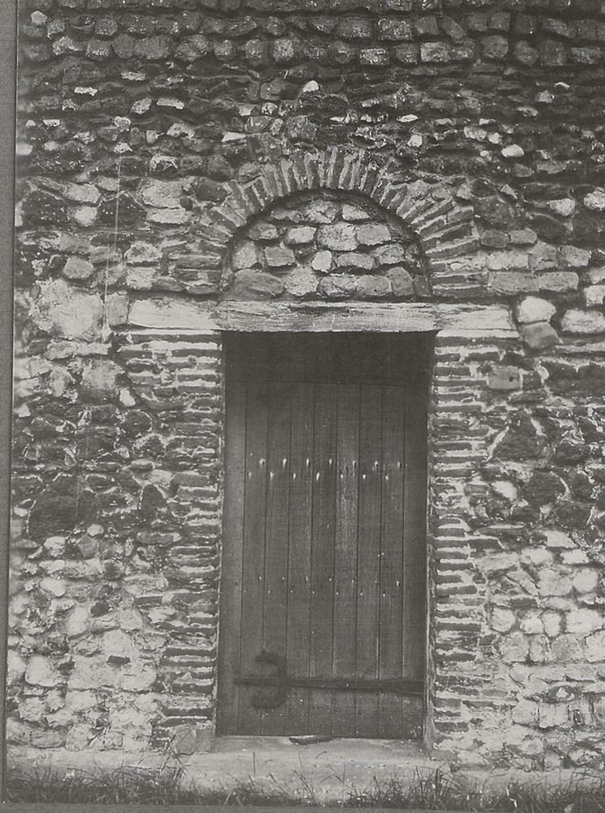 Black and white close up photograph of the north door and tiled arch, taken in 1925 and held by the National Monuments Record.