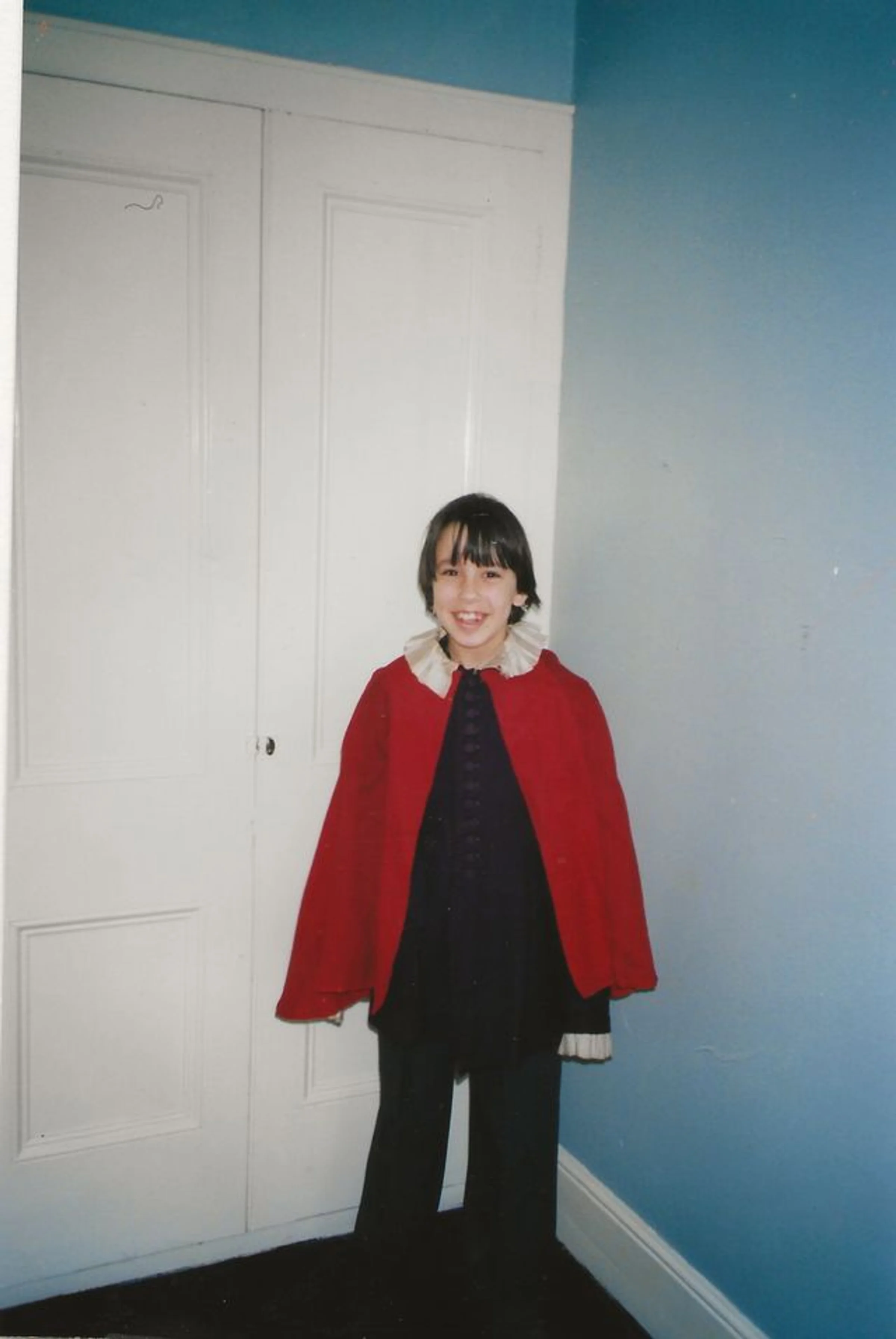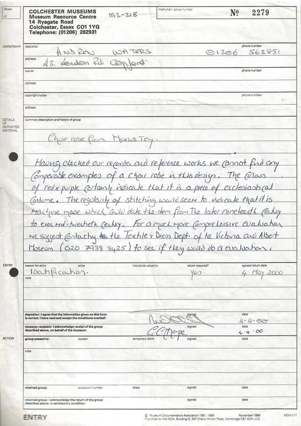 Photograph of a red cape which had been a choir robe at St Andrew's over a 100 years ago. It had been used by Cuthbert Wagstaff.