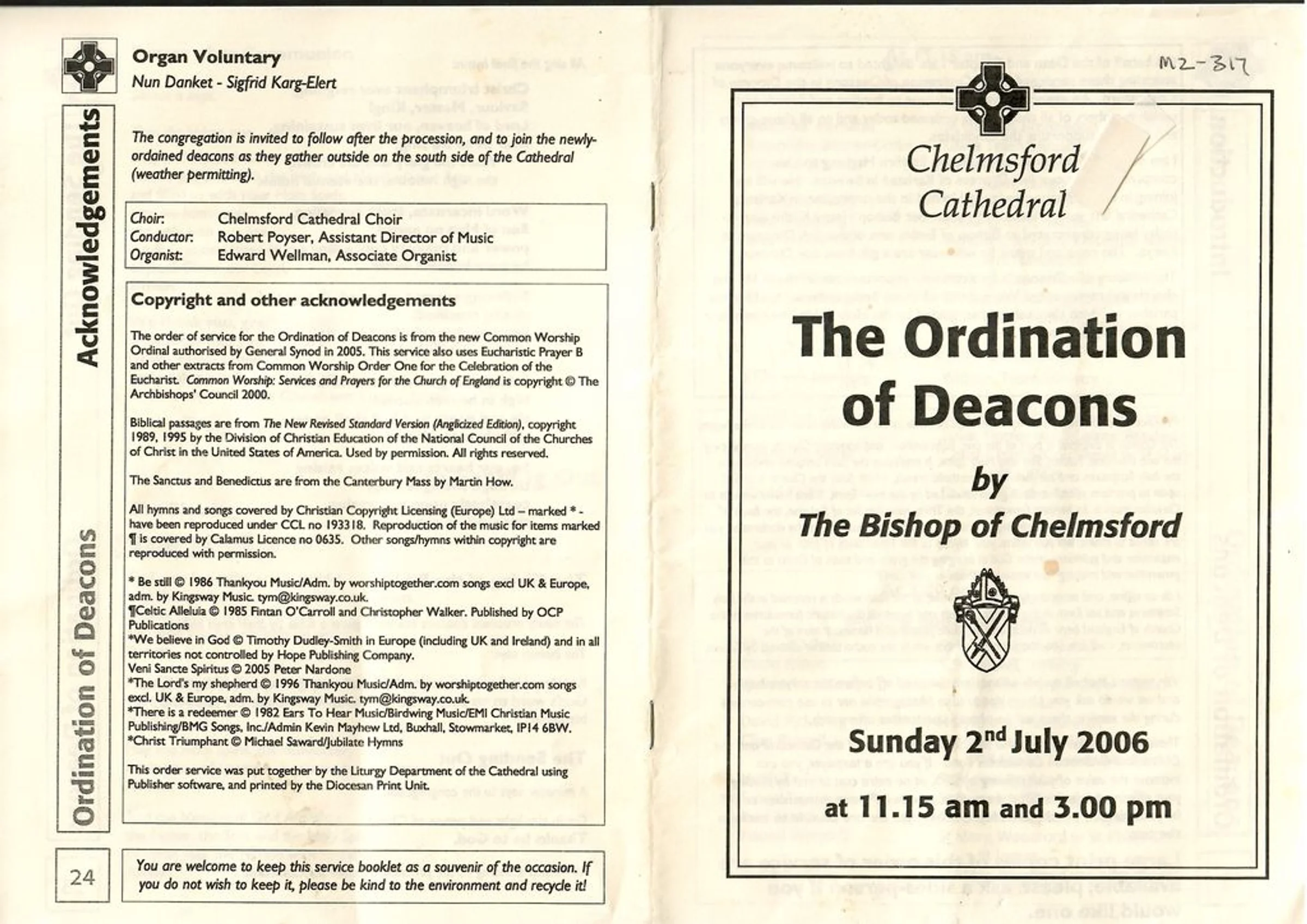Service sheet from "The Ordination of Deacons" in Chelmsford Cathedral, 2nd July 2006. Including Yvonne Irvine?