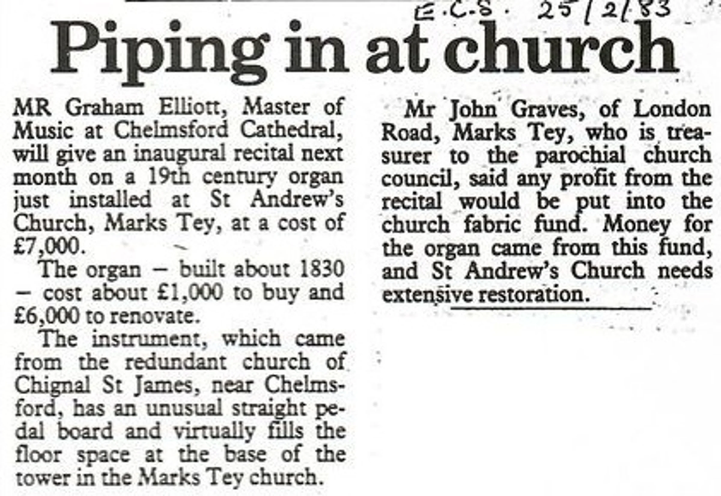 Two short articles, the first regarding the installation of a 19th century organ, and the second regarding a £400 donation to the fabric fund from the Friends of Essex Churches and the WI meeting.