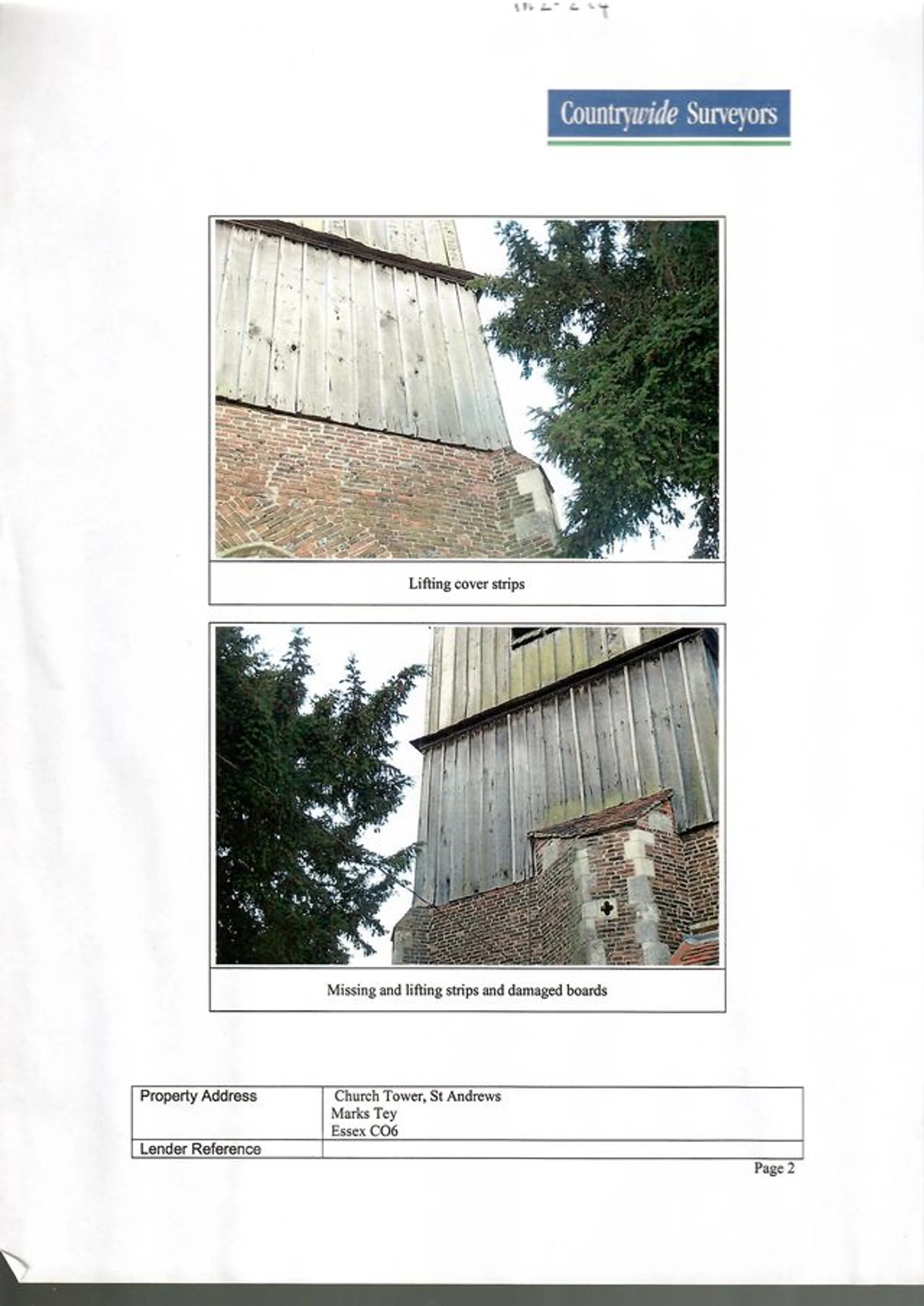 Two photographs of the exterior of St Andrew's Church tower, labelled "Lifting cover strips" and "Missing and lifted strips and damaged boards".
