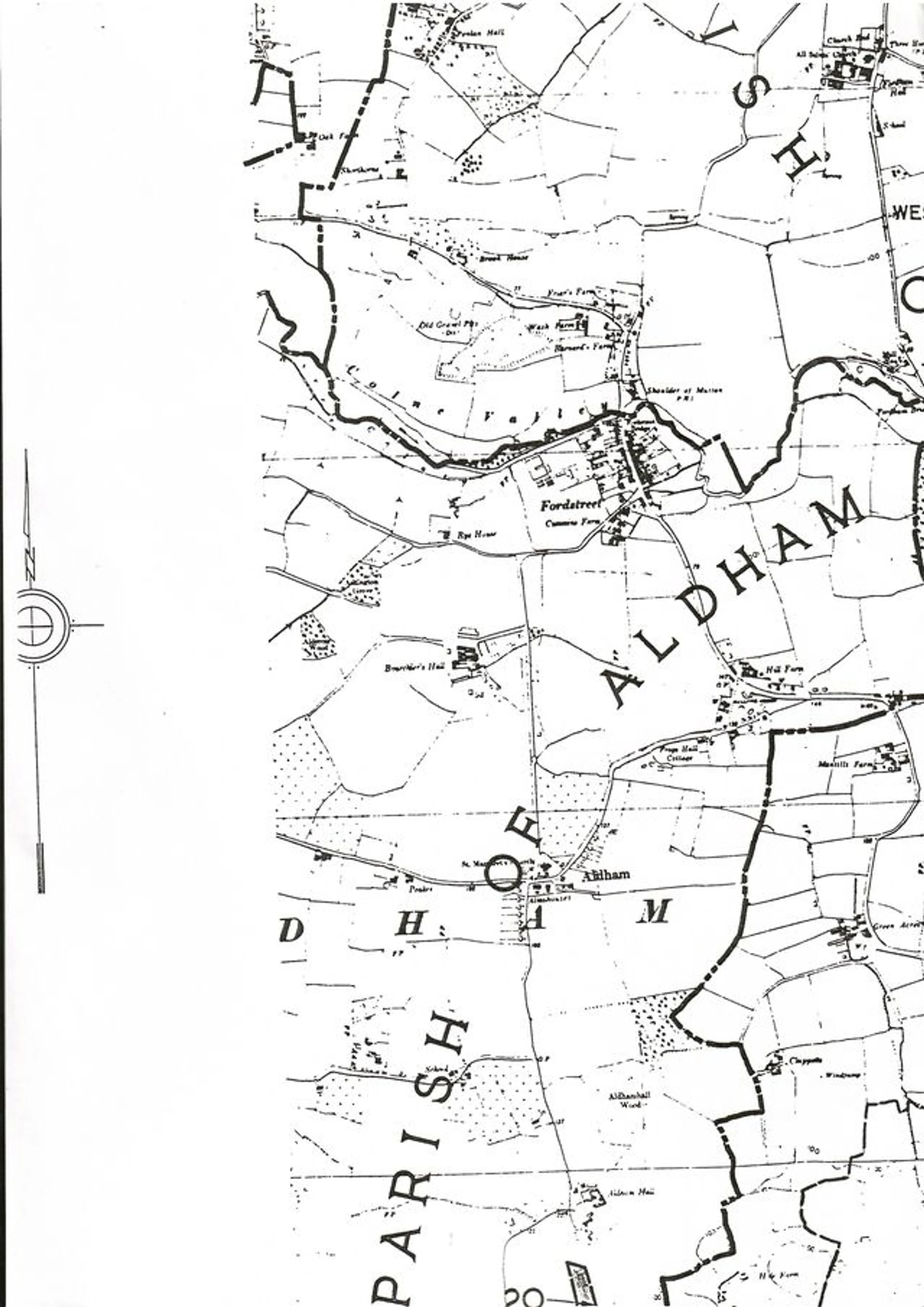 Section of a map delineating the new parish boundary, with Aldham.