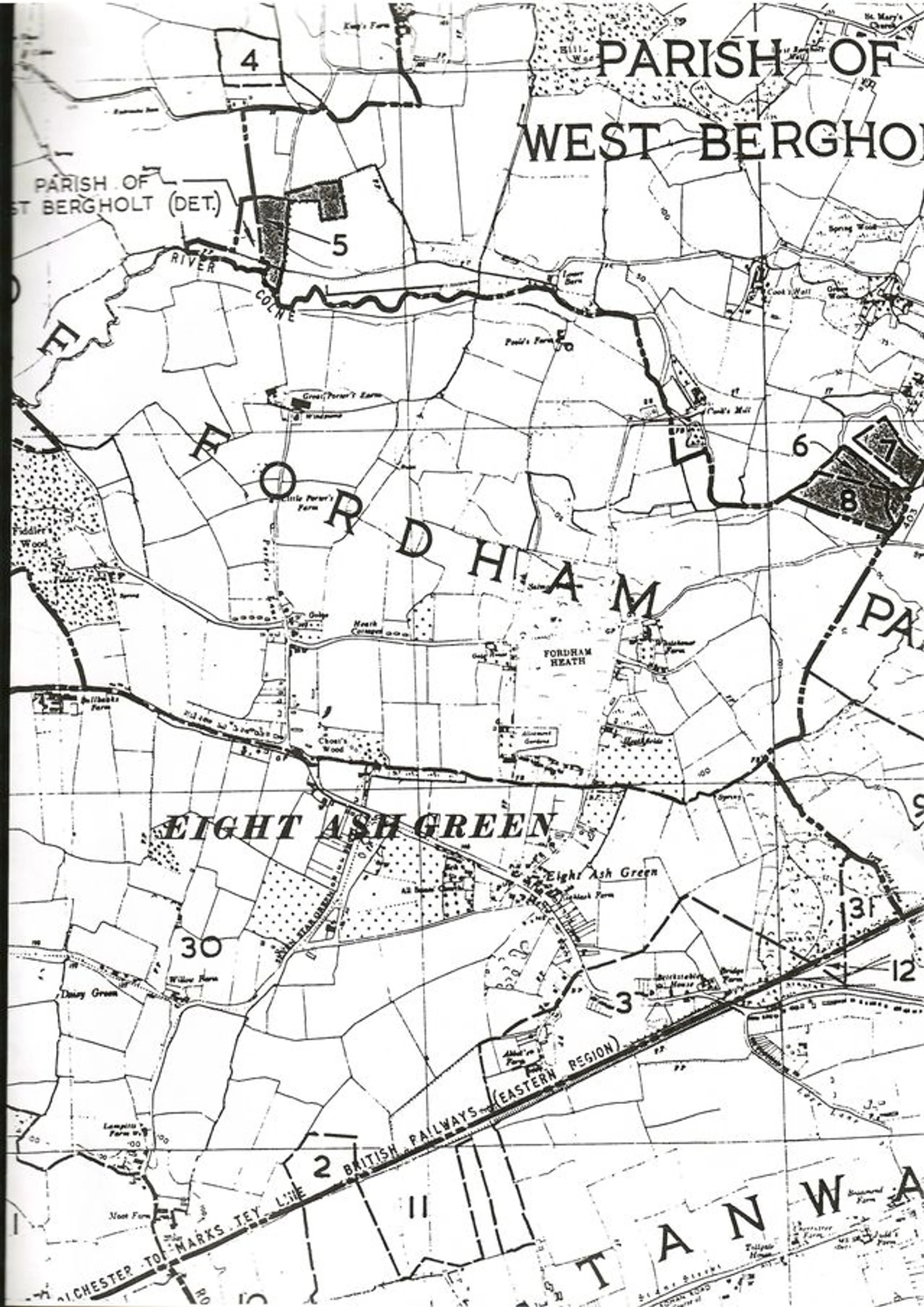 Section of a map delineating the new parish boundary, showing Fordham, Eight Ash Green, West Bergholt and Stanway, 1960.