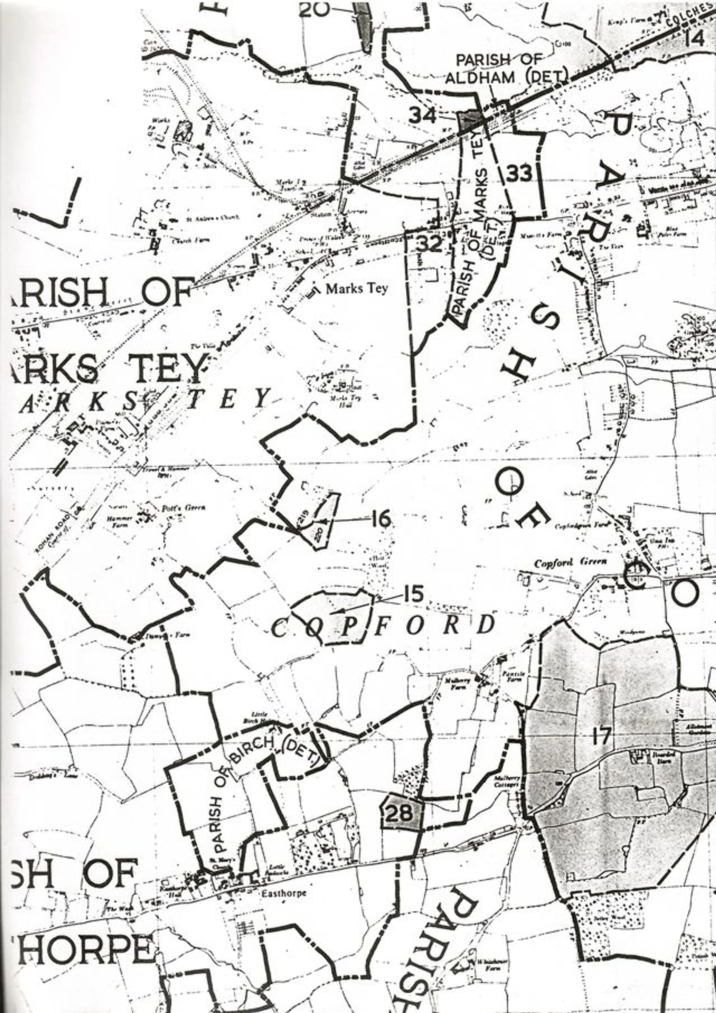 Section of a map delineating the new parish boundary, showing Marks Tey, Aldham, Copford and Easthorpe, 1960.