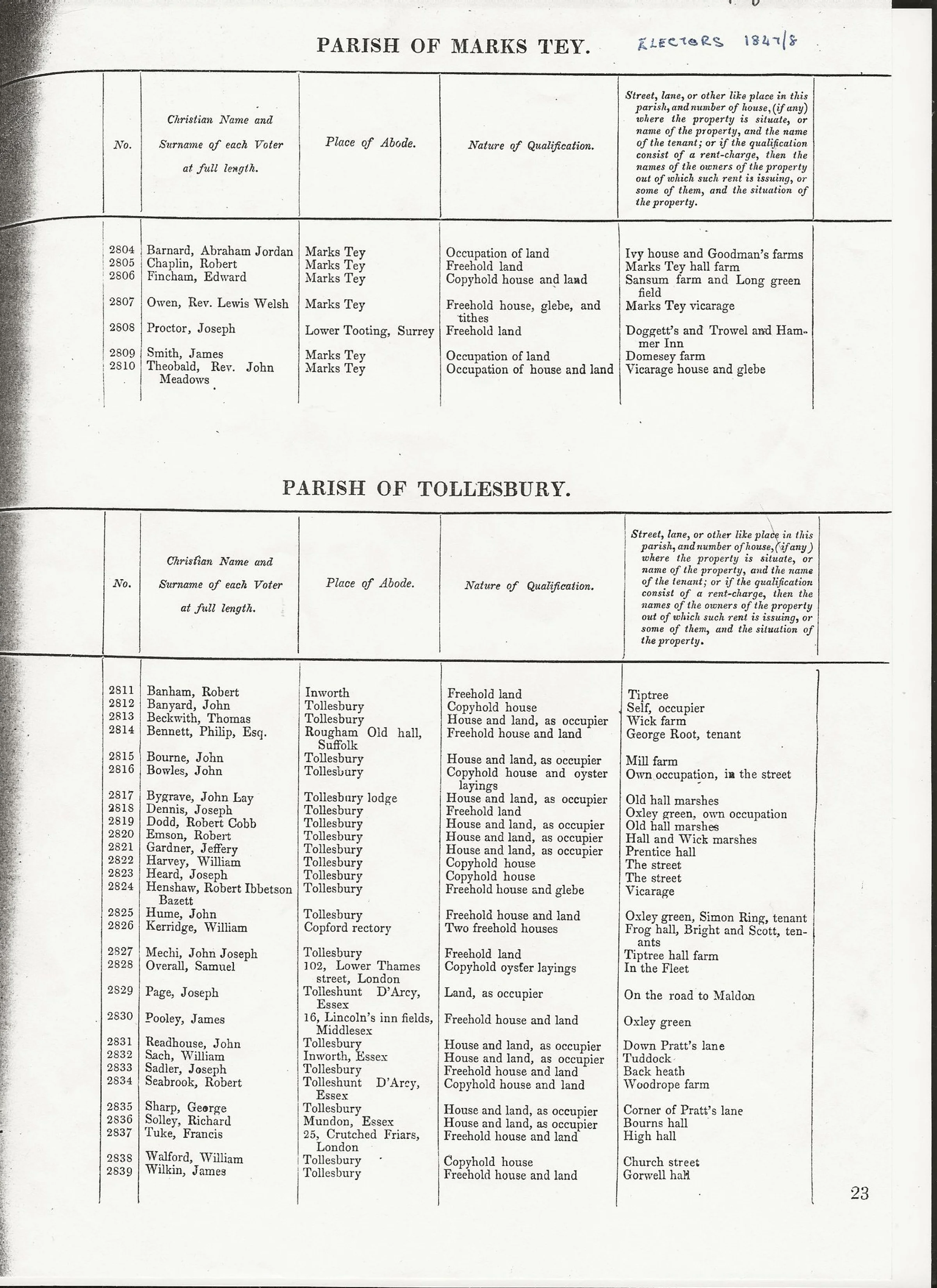 Published list of electors in the parish of Marks Tey, 1847.