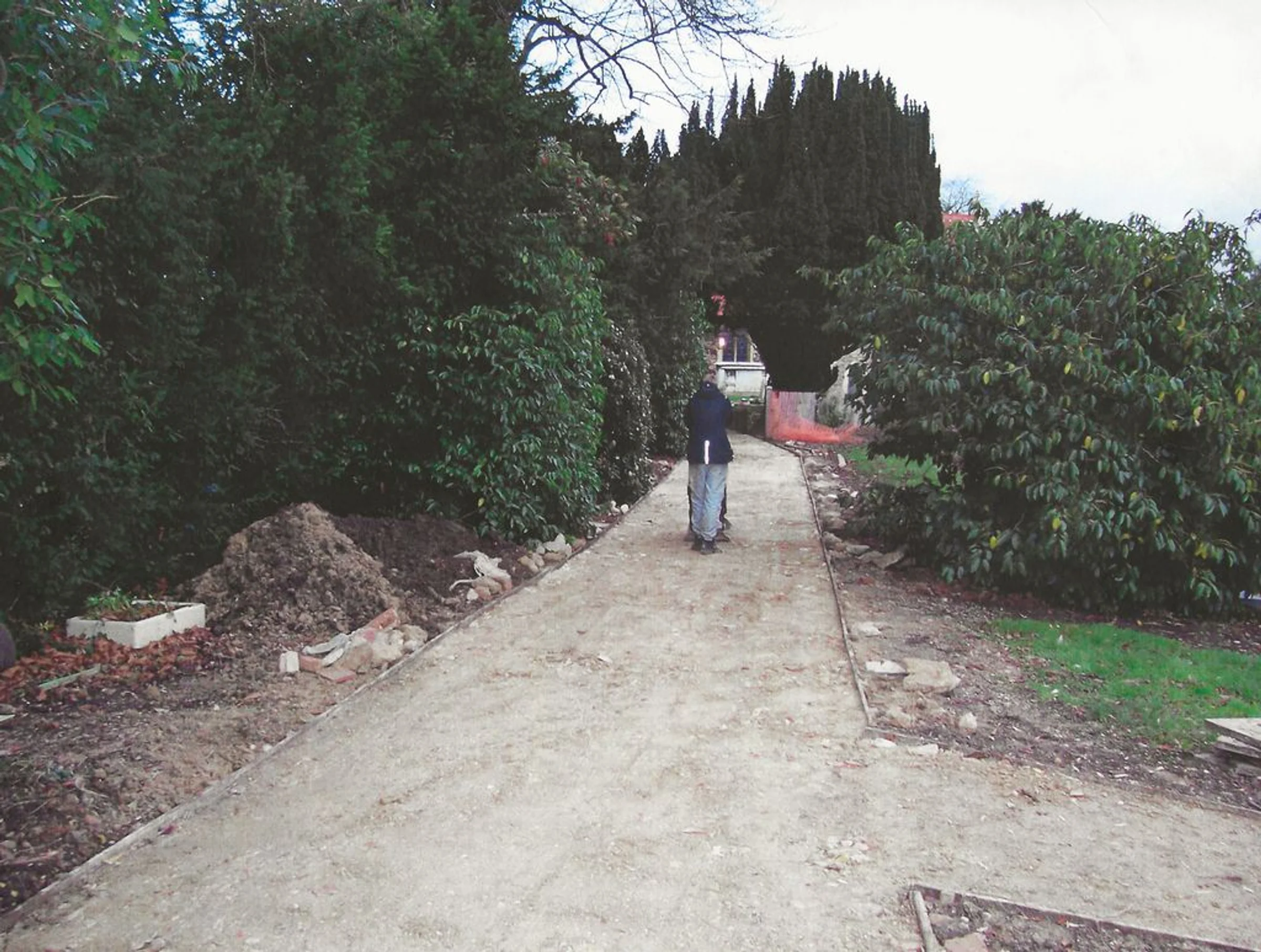 Photograph looking north showing the cleared and levelled path through the churchyard joining the new path from the car park, taken during the reordering.